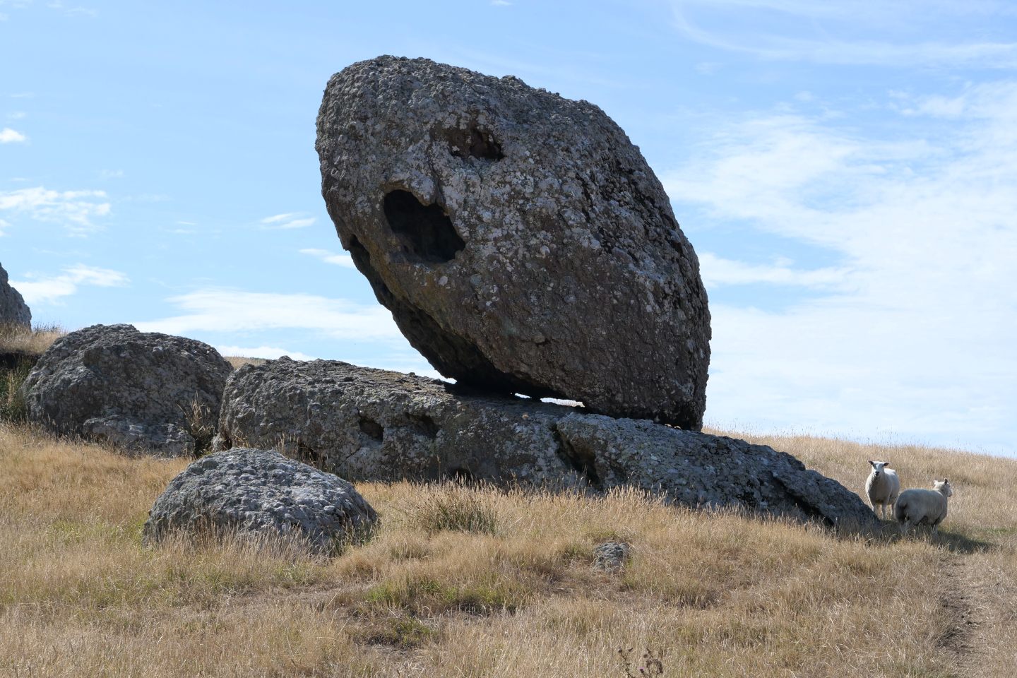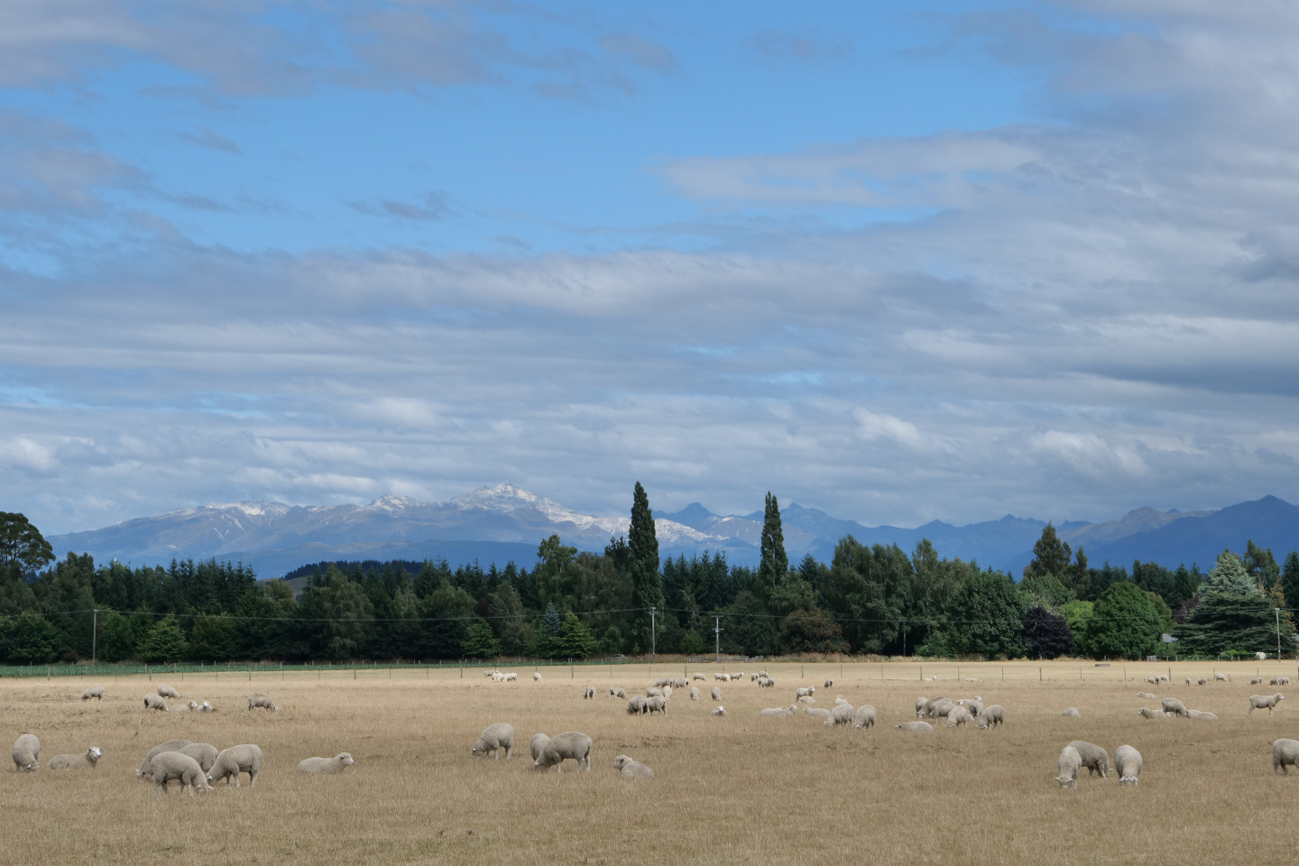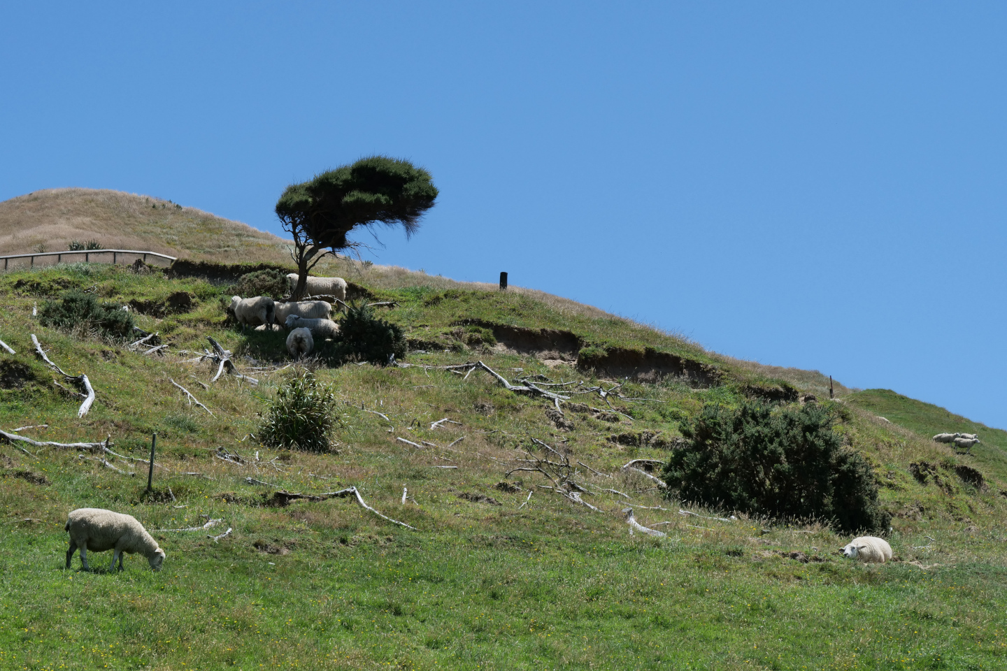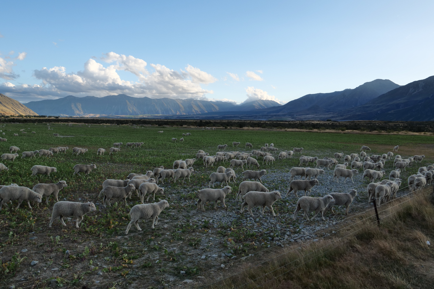 Natürlich gehören die Schafe Heutzutage zu Neuseeland. Doch Schaf ist nicht gleich Schaf. Es gibt grössere und kleinere, helle und gräuliche, mit schwarzem Kopf, mit mehr oder weniger gekräuselter Wolle, Merinoschafe und neuerdings sind auch die Walliser Schwarznasenschafe in Neuseeland anzutreffen. Dazu existiert eine Schafart welche ihre Wolle selbst abstösst und nicht zum «Coiffeur» geht. Kühe, Ziegen, vereinzelt Schweine, Pferde, Rehe, Alpakas… leben heute in Neuseeland. Ein Rätsel sind für uns auf beiden Inseln immer wieder zu findende Hügel, überdeckt mit einer riesigen weissen Plane und fixiert mit Autopneus. Erst gegen Ende der Reise haben wir Gelegenheit uns einer dieser Hügel unter die Lupe zu nehmen. Das Resultat: Heu welches auf diese Art und Weise fermentiert und haltbar gemacht wird.