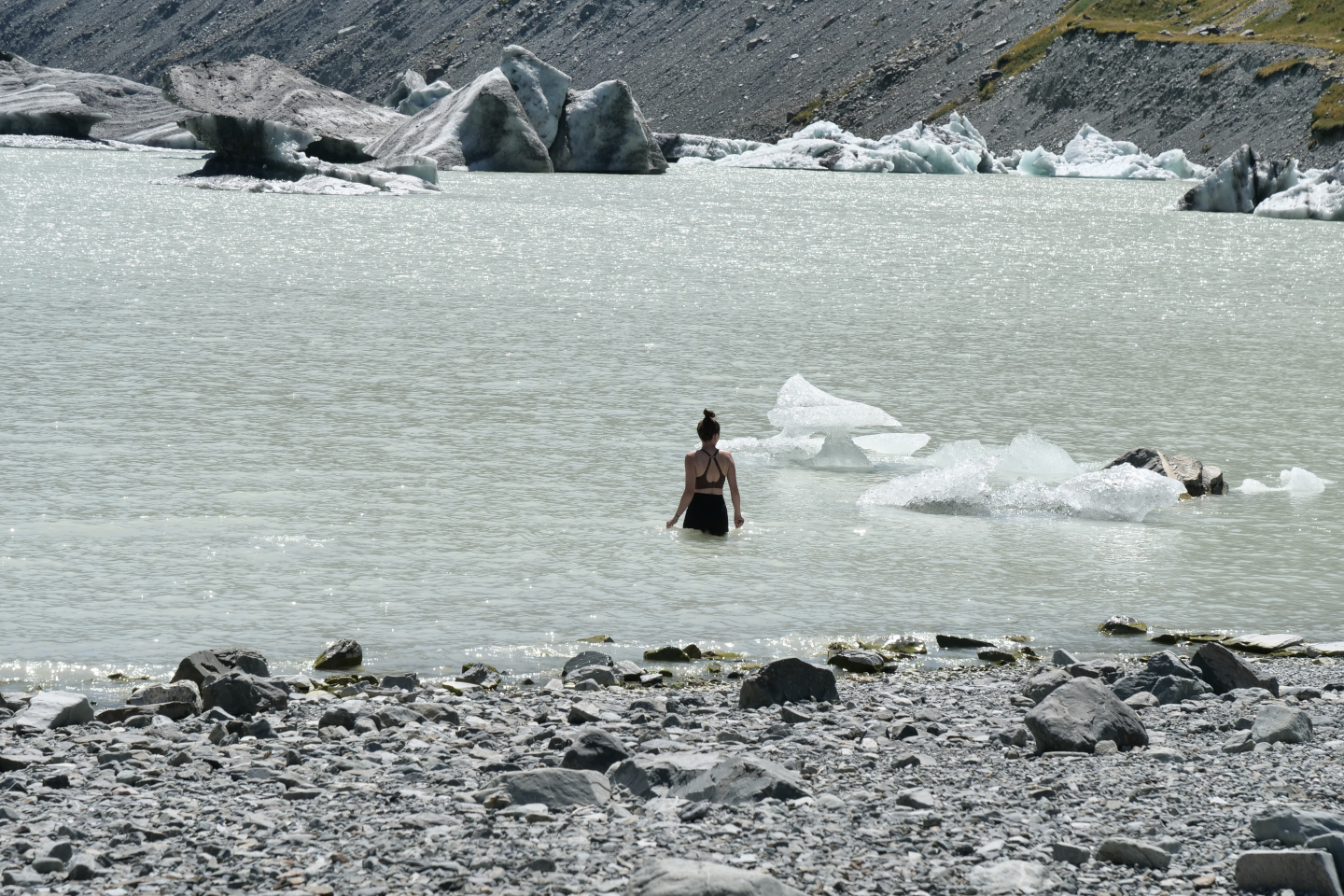 Enten beim Hooker LakeHooker Lake mit Mount CookBad im Hooker Lake