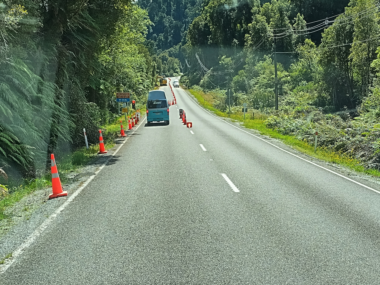 n Neuseeland herrscht links Verkehr. Ausser in den grösseren Städten wie z.B. Christchurch, Queenstown auf der Südinsel, Wellington und Auckland auf der Nordinsel, herrscht wenig Verkehr. Die Strassen sind jedoch z.T. in die abgelegensten und kaum bewohnten Gegenden gut erhalten. Im Landesinnern (dort wo es noch Strassen hat) sind es oft enge Schotterstrassen. Eine Besonderheit sind die vielen einspurig befahrbaren Brücken, kaum breiter als ein Lastwagen und seitlich kaum geschützt. Zum schmunzeln bringen uns jeweils die dicht aneinander gereihten Strassenkegeln bei Baustellen. Ob es da wohl irgendwo einen Mengenrabatt gibt?