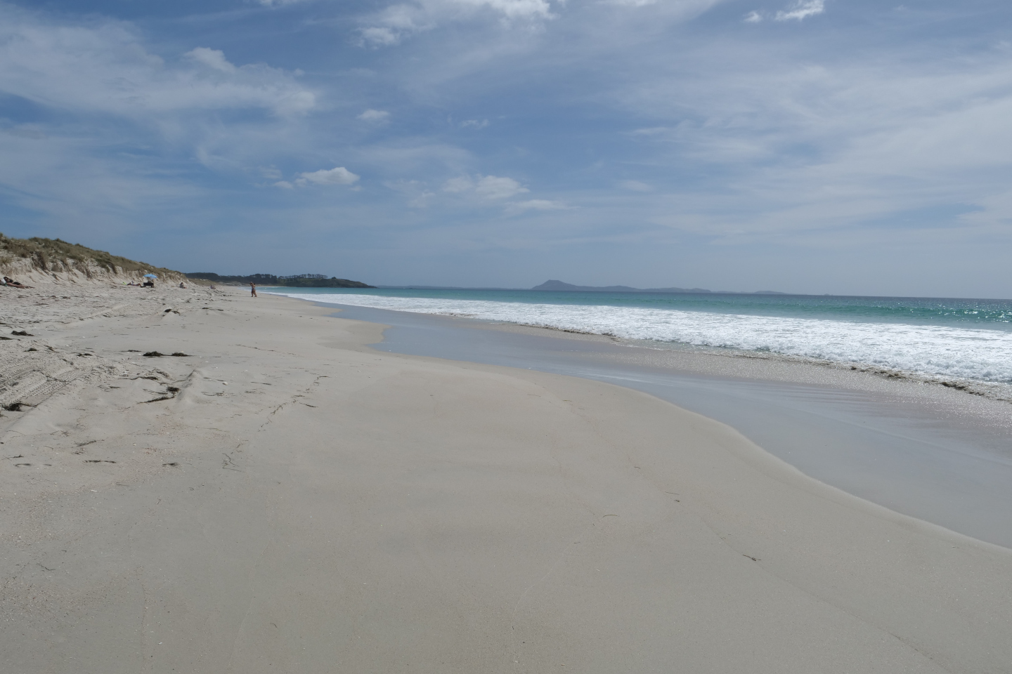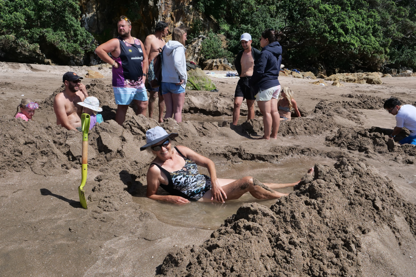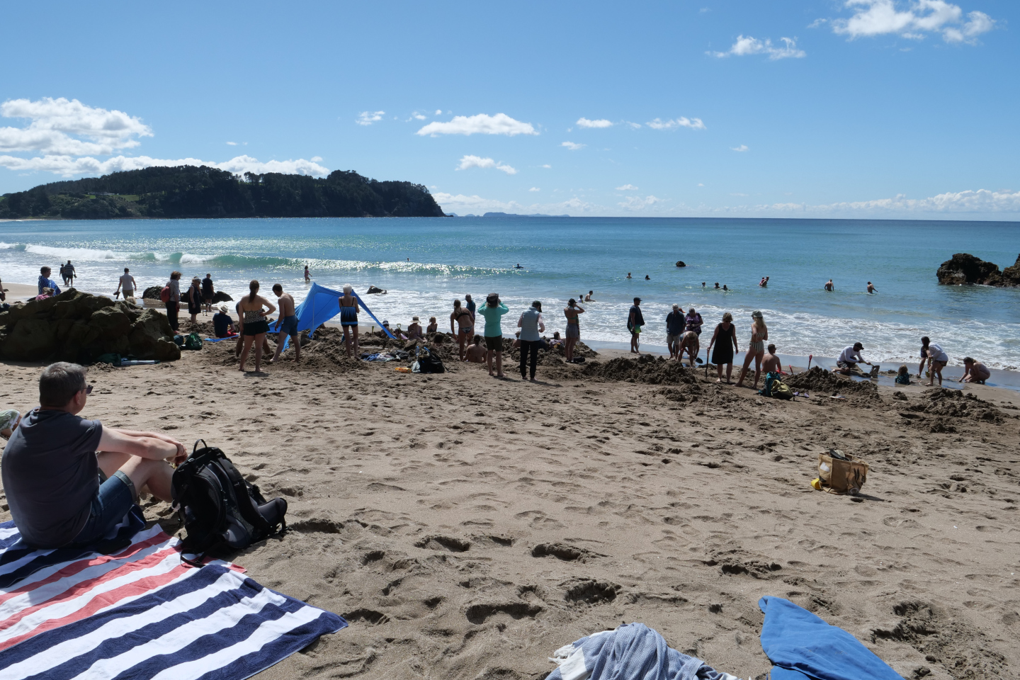 Die Coromandel Halbinsel entdecken wir als eine der letzten Gegenden der Nordinsel. Der Hot Water Beach, wo auch wir unseres privates Loch im Sand graben, beschert uns erst mit kaltem, zu heissem und endlich mit angenehmen Temperaturen. Wir geniessen das Bad (in der Menge).