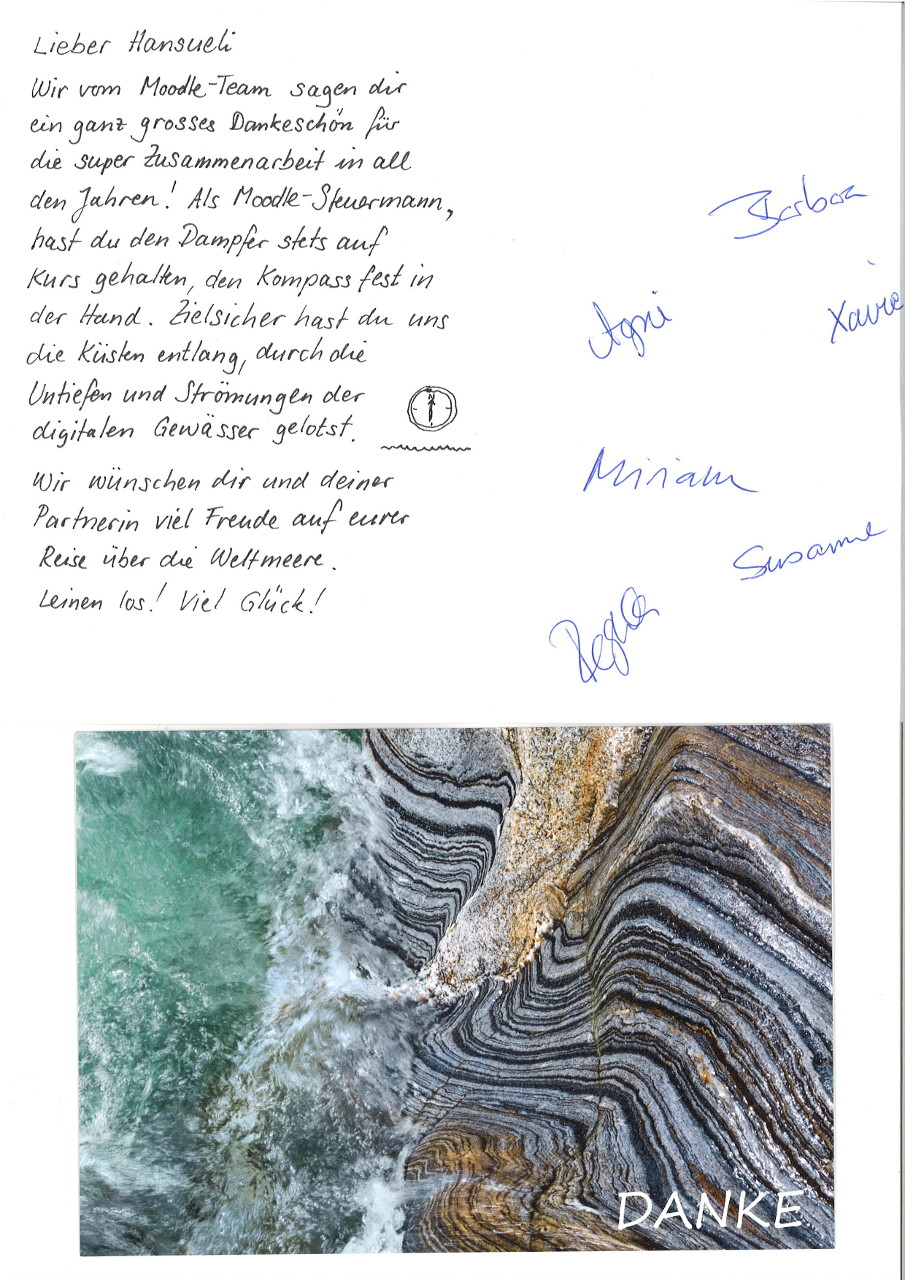 Heute war meine letzte Sitzung mit dem E-Learning Team. Mit einigen Teammitgliedern arbeitete ich über 10 Jahre zusammen. Manchmal kam es mir im Team vor, wie wenn wir innerhalb der Schule eine Insel sind, auf der eine gute gegenseitig unrestützende Zusammenarbeit ohne Profilierung von Einzelen noch gelebt wird.
