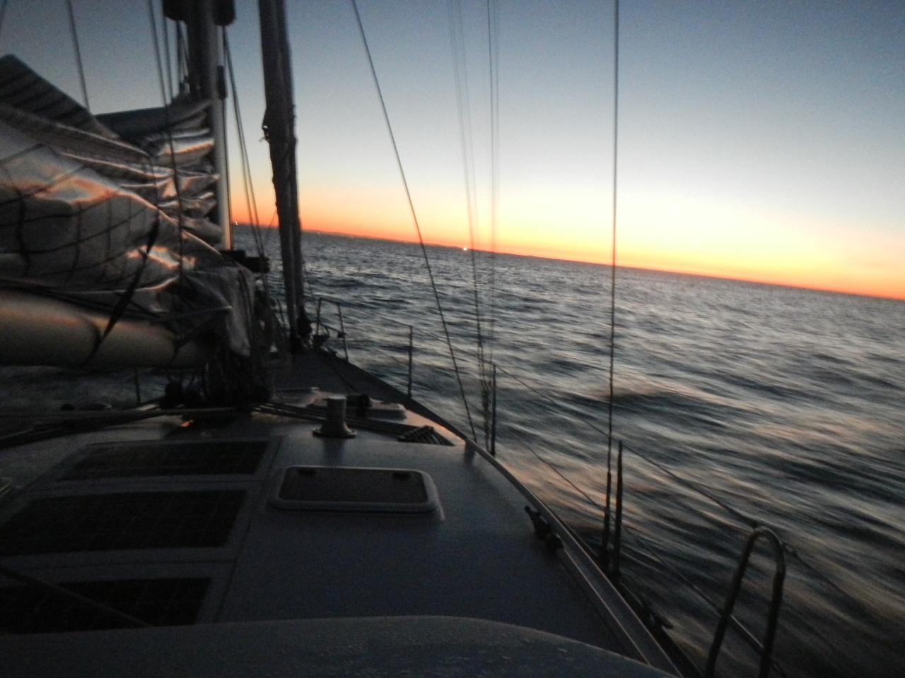 Wir lassen die Leinen in Port Chantereyne bei Flut um 01:40 los . Ungefähr 600 sm liegen vor uns. Dazu kommen, was wir in diesem Moment noch nicht wissen, zwei pechschwarze Nächte, ohne Mond, ohne Sterne. Wir fahren einfach in ein schwarzes „Etwas“. AIS und Radar helfen uns in dieser Situation, selbstverständlich nebst einem guten Ausguck der Wache, uns sicher fühlen. Es hat wenig Wind dafür zieht uns die Strömung in die richtige Richtung und wir setzen das erste Mal unser neues Leichtwindsegel, den Code 0 und machen gute Fahrt am Wind.