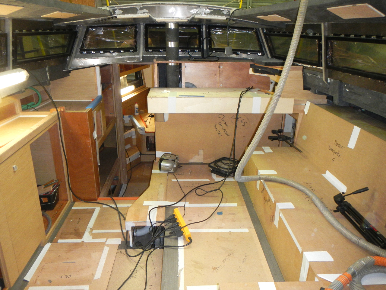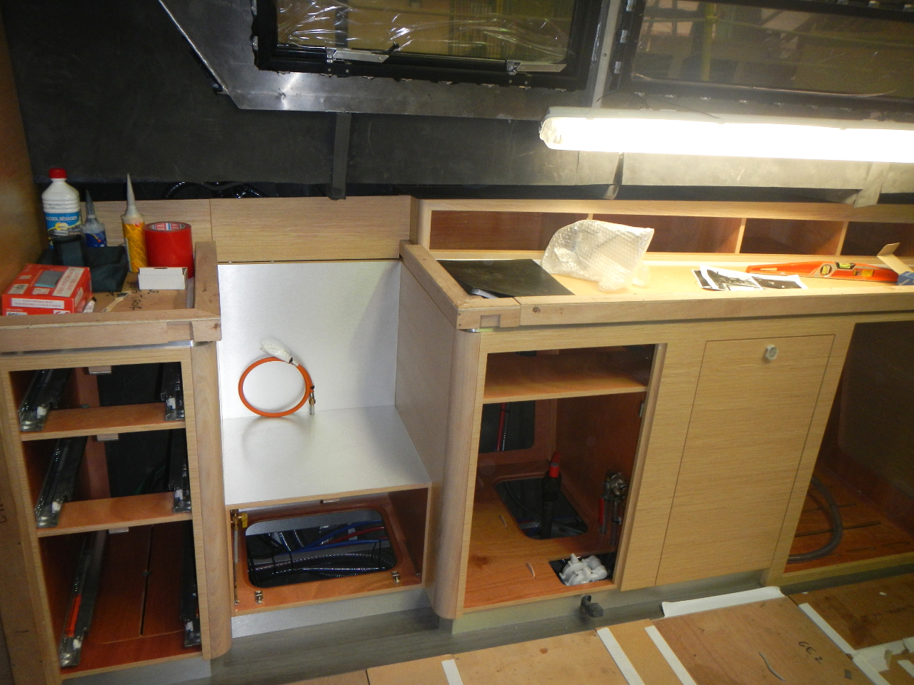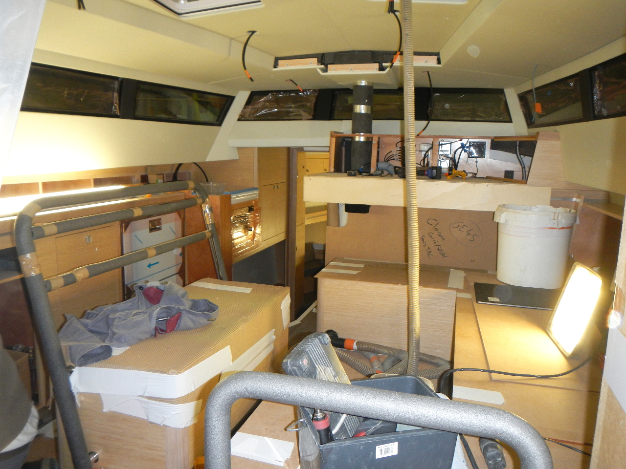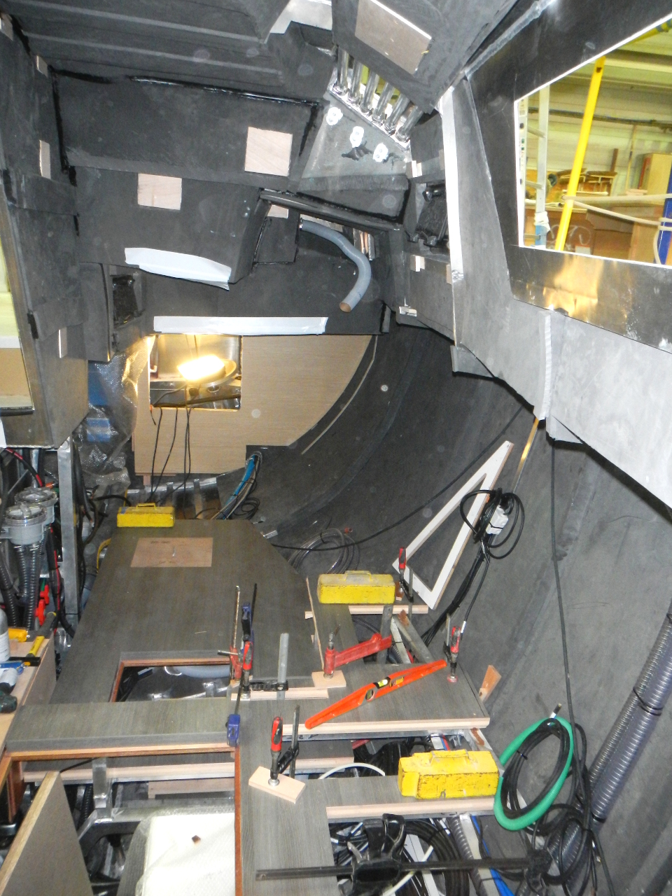 Das Bett und die Schränke in der Bugkabine sind eingebaut. Der Boden im Salon gelegt. Die weisse Trennwand zwischen Bugkabine und WC steht. Die Möbel werden in einer externen Schreinerei vorgefertigt.