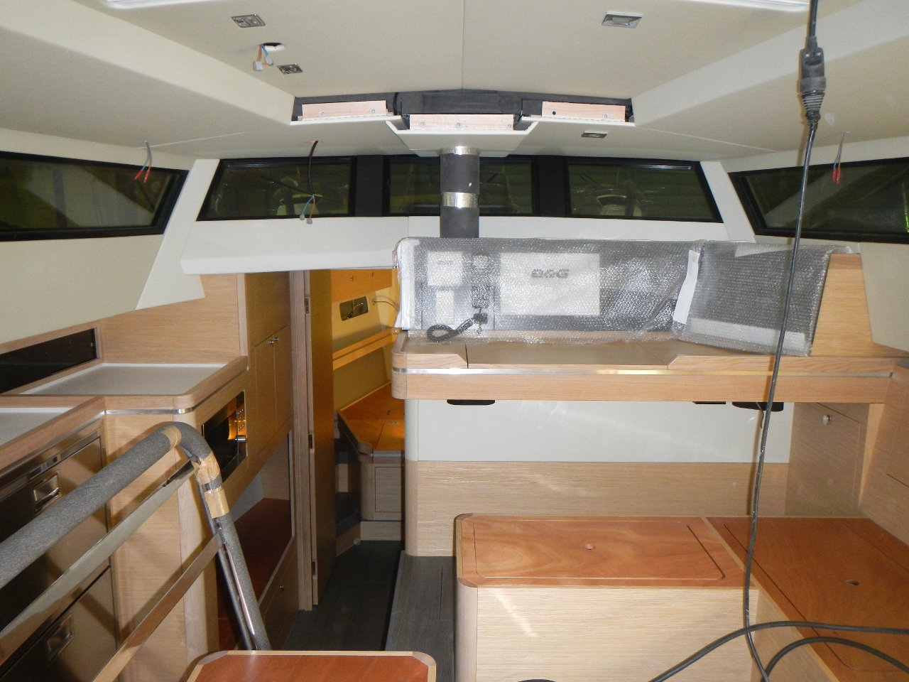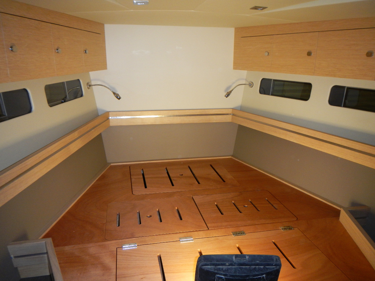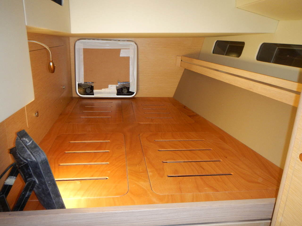 Das Bett und die Schränke in der Bugkabine sind eingebaut. Der Boden im Salon gelegt. Die weisse Trennwand zwischen Bugkabine und WC steht. Die Möbel werden in einer externen Schreinerei vorgefertigt.