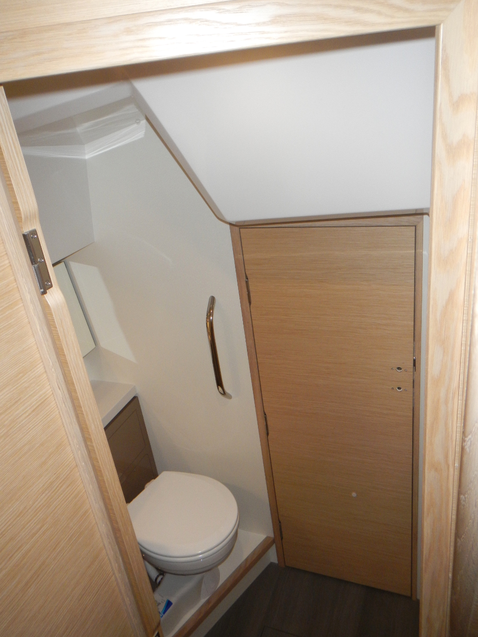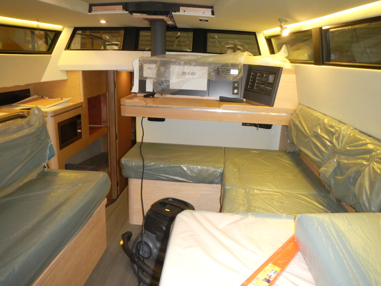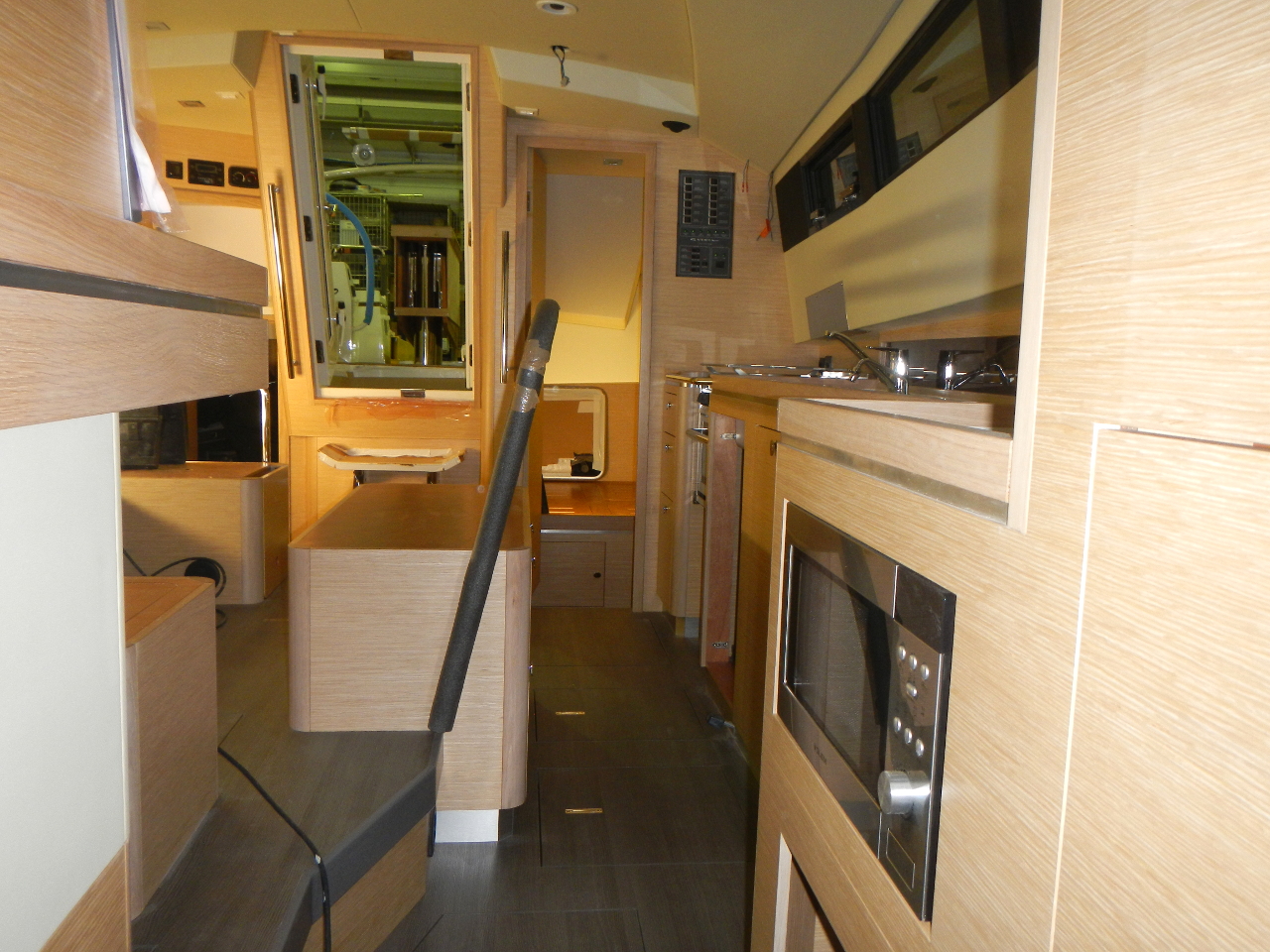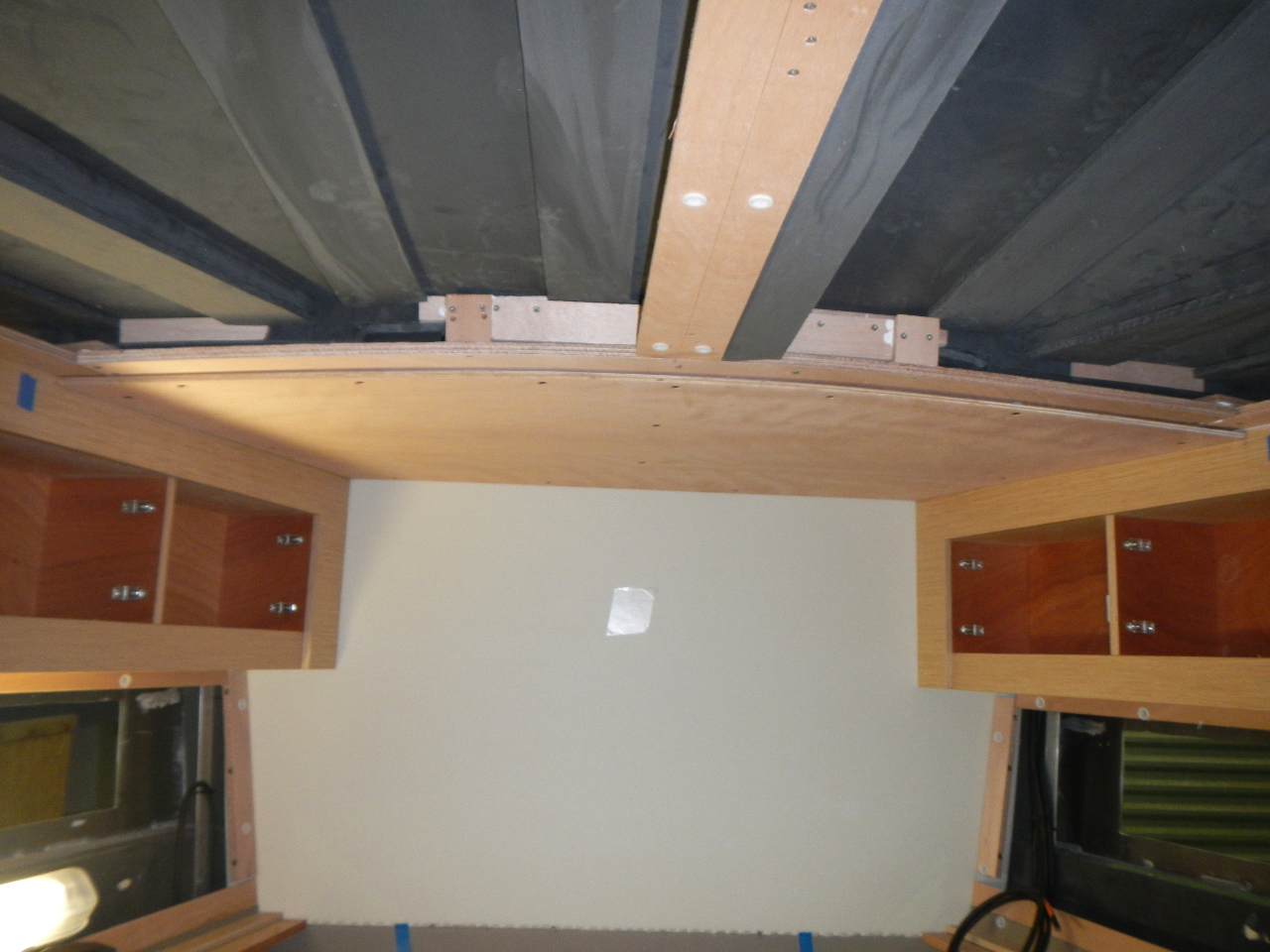 Das Bett und die Schränke in der Bugkabine sind eingebaut. Der Boden im Salon gelegt. Die weisse Trennwand zwischen Bugkabine und WC steht. Die Möbel werden in einer externen Schreinerei vorgefertigt.
