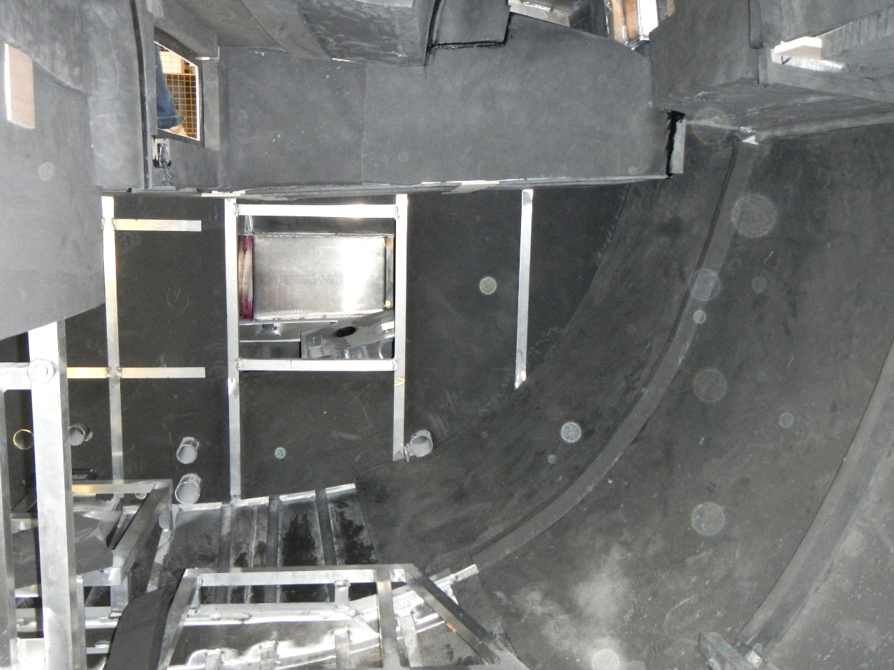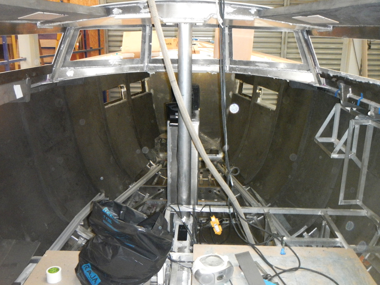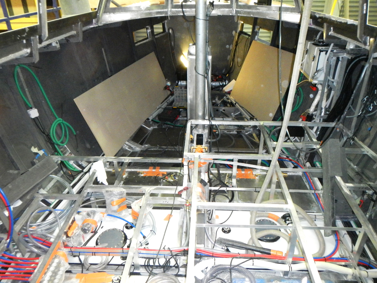 Bei unserem ersten Besuch auf der Werft war der Rumpf noch leer. Im Boden waren die beiden weissen Wassertanks, die drei Alu-Dieseltanks und der blaue Abwassertank eingebaut.