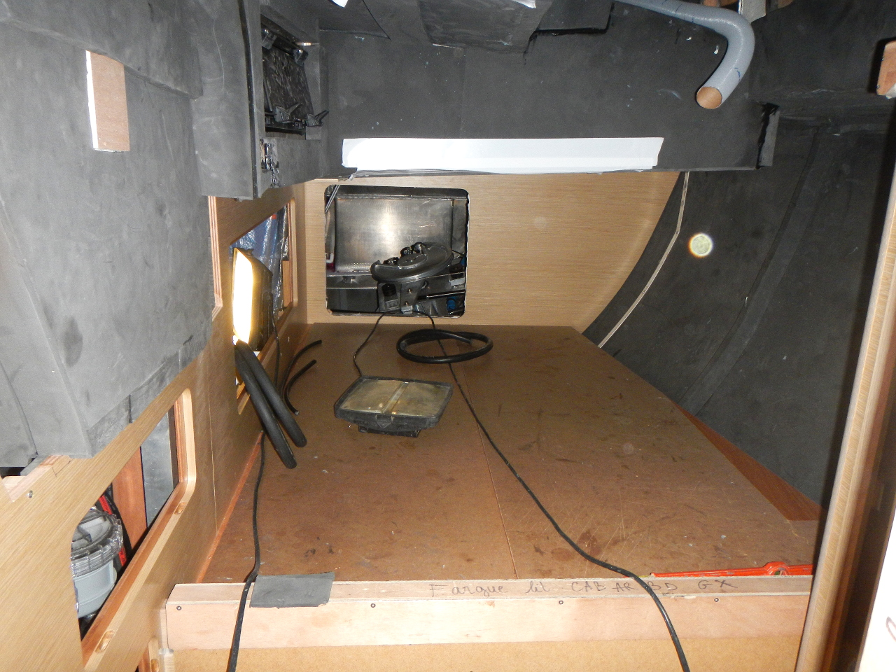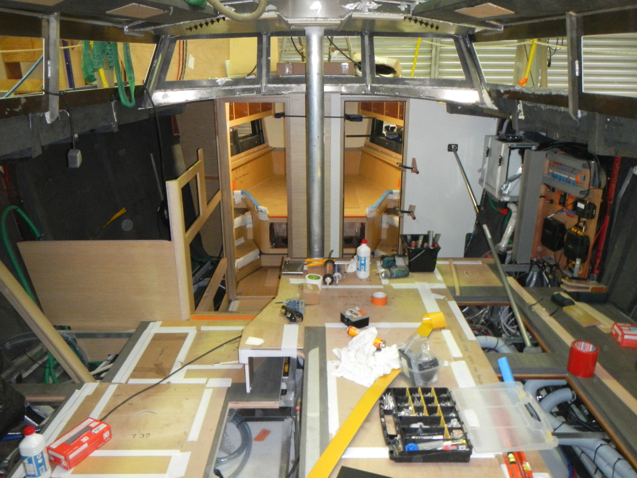 Der Rohbau vom hinteren Teil unserer neuen Dada Tux. Auf der linken Schiffsseite (in der Bootssprache 'Backbord') wird die Gästekabine eingebaut. Auf der anderen Seite (Steuerbord) entsteht der Stau- und Technikraum. Davor, zwischen Salon und Stauraum, wird die Dusche und ein WC eingebaut.