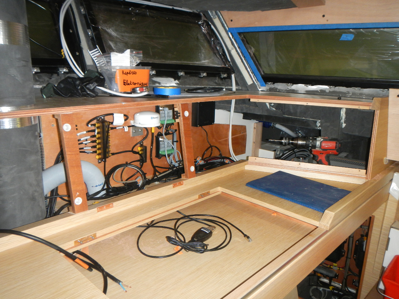 An der hinteren Wand hängt das Batterieladegerät. Damit werden die Batterien geladen, wenn wir in einer Marina 230V Anschluss haben. Das andere blaue Gerät an der Wand ist der Inverter. Mit dem können wir vom Batteriesstrom 230V herstellen. Damit können wir ohne externen Strom unsere Notebooks, die Waschmaschine oder Mixer benutzen.