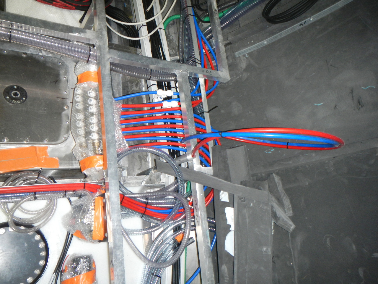 Danach wurde ein Gewirr von Leitungen und Kabel verlegt. Die blauen Rohre sind für kaltes Wasser, die roten für warmes Wasser.