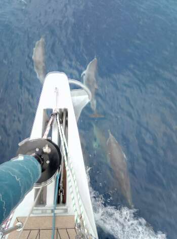 2 mal hatten wir heute Besuch von sehr vielen Delfinen. So viele zusammen sahen wir noch nie. Für Delfine ist es scheinbar ein besonderes Vergnügen direkt vor den Bug zu schwimmen.