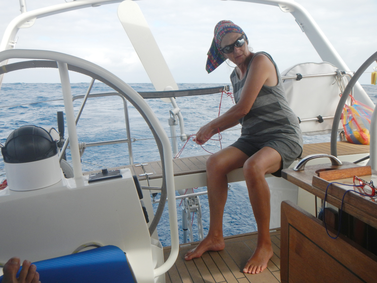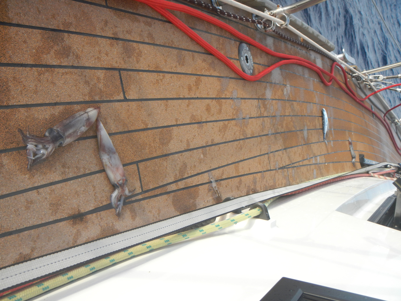 Es stellt sich ein Tag-Nachtrhythmus ein: Zwei mal täglich rufen wir die Wettervorhersage über Predictwind ab, entscheiden danach unsere Segelstrategie (Kurs, Besegelung). Die frischen Lebensmittel werden täglich kontrolliert. Wir haben frisches Obst bis zum 34. Tag, Gemüse (Kürbis, Zwiebeln, Knoblauch, Zitrone und Ingwer) bis nach Honolulu. Ebenso dazu gehört ein tägliche Kontrollgang auf Deck. Unsere Wachen dauern jeweils ungefähr 5 Stunden, für uns eine gute Lösung. Das gibt jedem von uns einige Stunden Schlaf am «Stück». Tagsüber schlafen wir nach Bedarf. Die fliegenden Fische und Tintenfische verstehen nach wie vor nicht, dass sie besser von Bord bleiben, hinterlassen ihre glänzenden Schuppen und ihre Tinte. So finden wir täglich einige auf dem Laufdeck.
