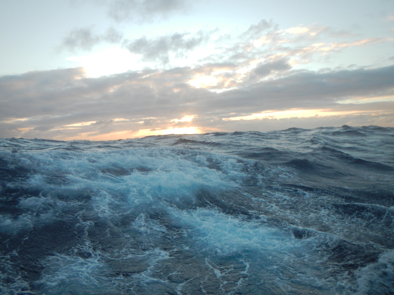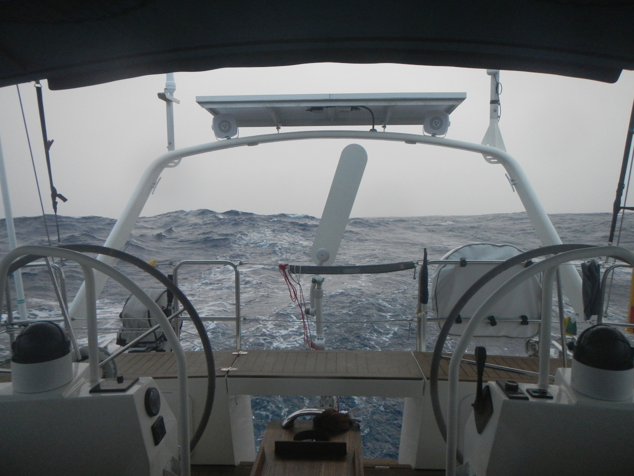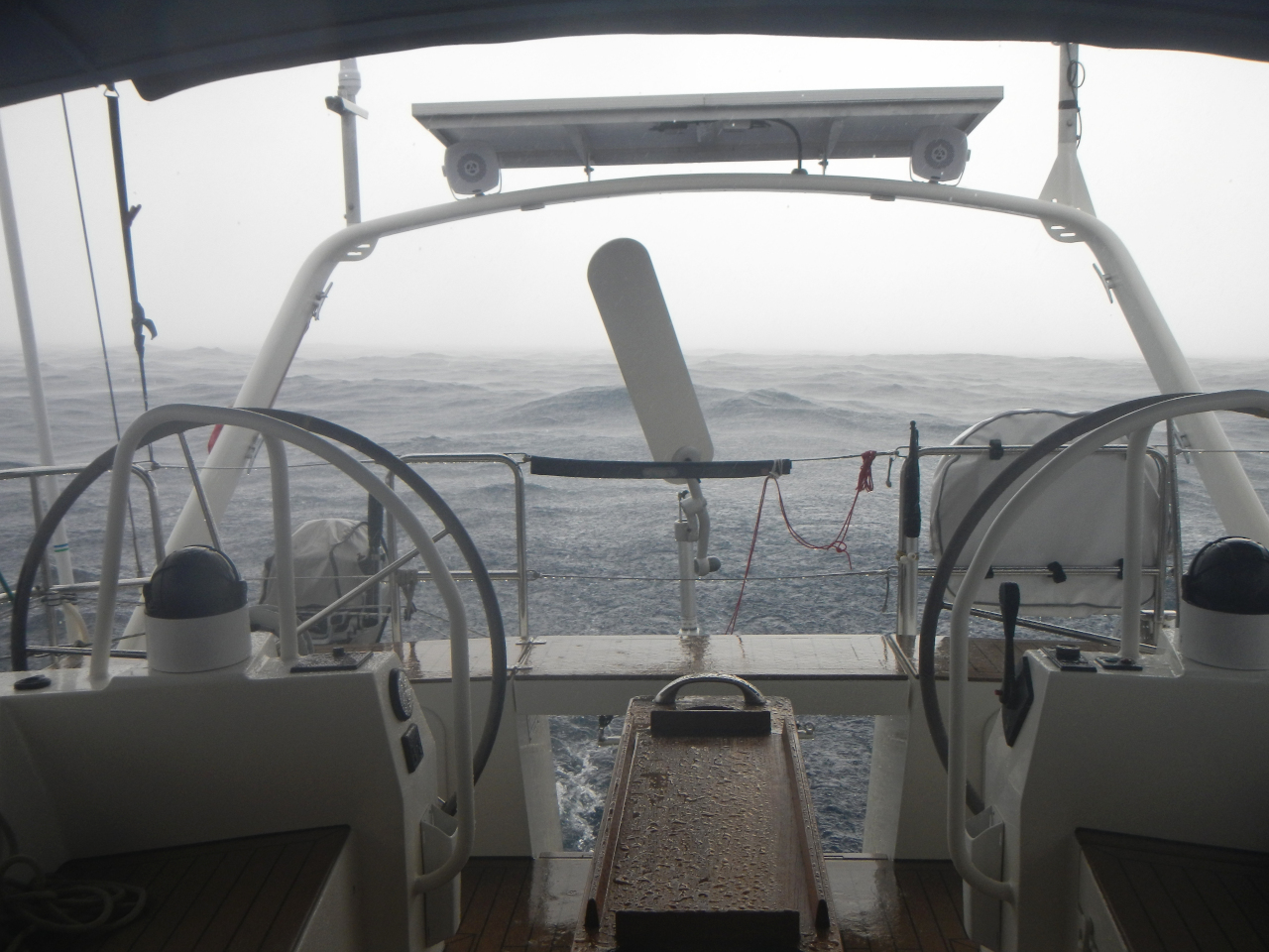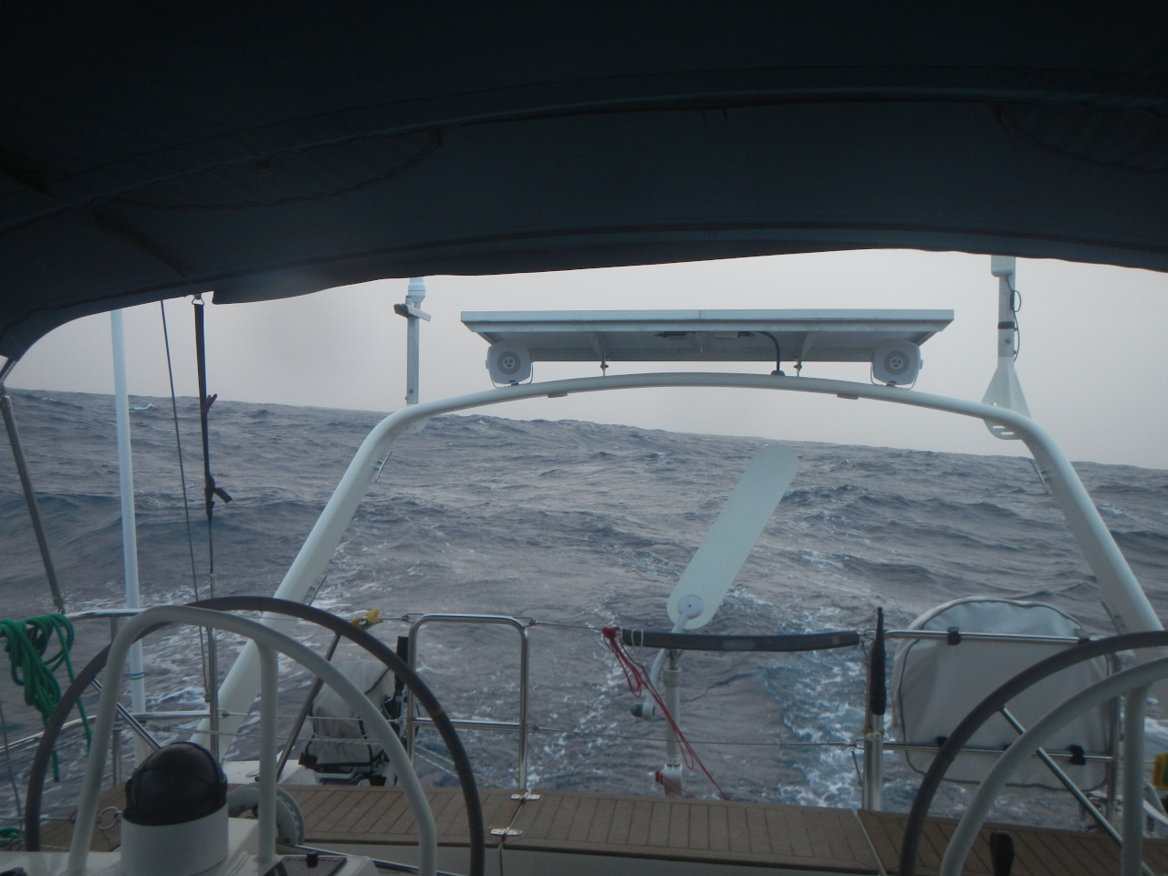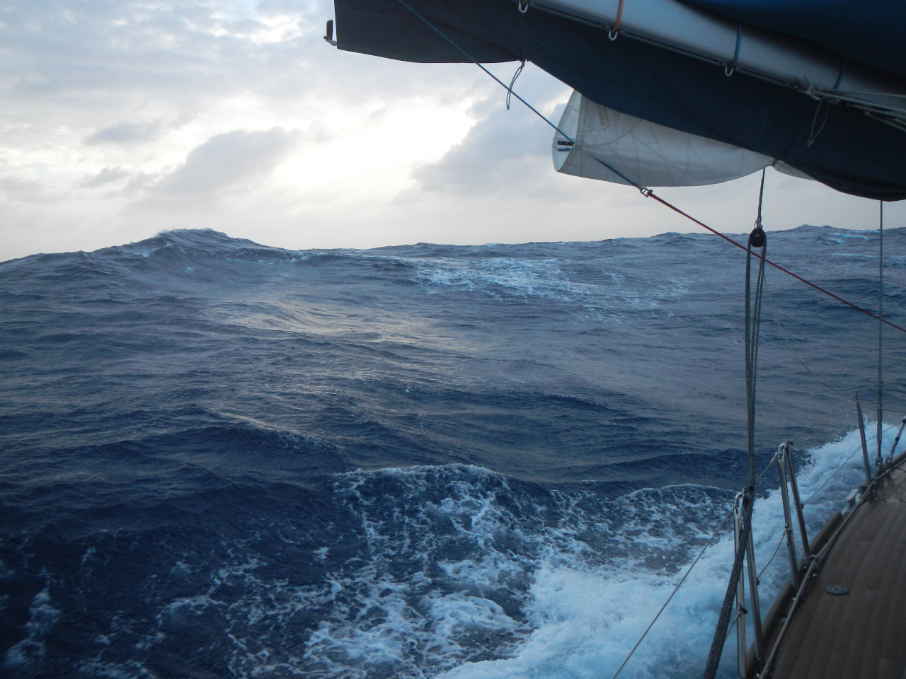 Die nächste Wettervorhersage sagt in einigen Tagen Starkwind und bis zu 5 Meter hohe Wellen an, gerade dann wann wir laut unseren Berechnungen dort sein sollen. Wir entscheiden uns die Segelfläche stark zu reduzieren und 2-3 Tage zu «dümpeln», damit es uns nicht allzu stark erwischt. Nicht immer können wir den direkten Kurs halten, wir laufen zu südwärts (für den Sturm jedoch besser) und halsen später. Wir entscheiden uns das Bimini zurück zu setzen, damit eine eventuell hohe Welle das Bimini nicht zerdrückt, schauen nach ob wir genügend Gas haben, damit wir die Gasflasche ganz hinten auf der Heck nicht wechseln müssen und bereiten uns auf diese Starkwindphase vor. Ab dem 31. Tag haben wir viel Wind (bis zu 44 kn) und hohe Wellen querab und wir ändern den Kurs, damit die Wellen achterlicher kommen. Bei Hansueli und mir sind sie immer unterschiedlich hoch, meine sind etwas höher als die von Hansueli aber wir einigen uns auf etwa 4 Meter. Das erste Mal überhaupt schwappt eine Welle ins Cockpit und ein kleiner Strahl fliesst in den Salon, weil wir die Türe nicht vorsorglich schliessen. Bis einen Tag vor unserer Ankunft in Honolulu segeln wir mit Reff 3 im Gross, dem Kutter vor allem nachts ebenfalls im 3. Reff. Brecher peitschen über die Dada Tux hinweg, auch über die Doradenlüftung kommt Wasser ins Boot. Es ist ungemütlich. Am 37. Tag werden wir von einer Welle stark seitwärts gelegt. Der Bilgenalarm im Heck geht los, so dass wir kontrollieren und Wasser absaugen. Langsam kommt Hawaii (Big Island) in Sicht und Wind und Welle verändern sich laufend. Die letzte Wache verbringen wir bei Vollmond entscheiden uns am letzten Tag mit Unterstützung des Motors zu segeln, damit wir vor der Dunkelheit Honolulu anlaufen können.
