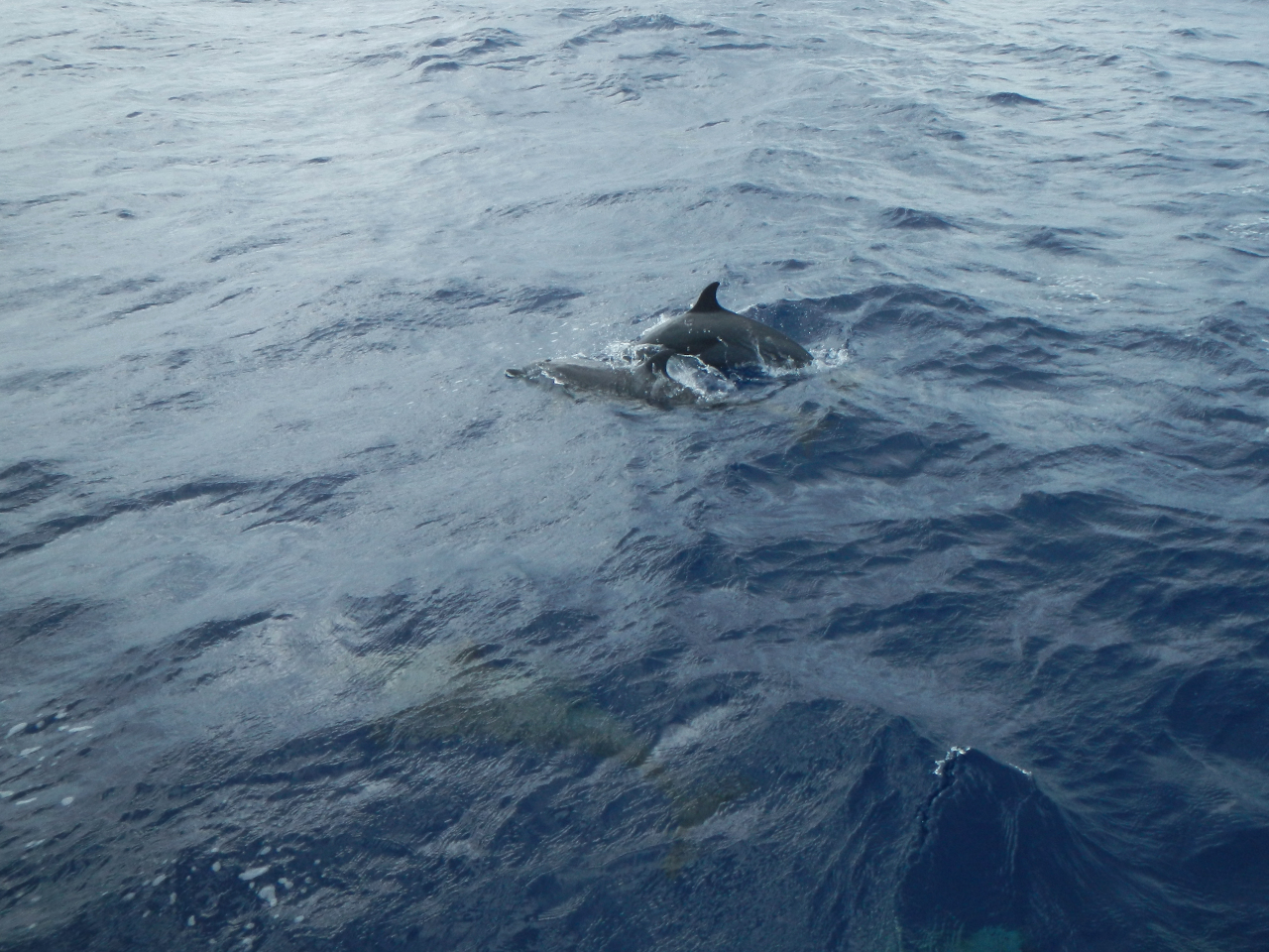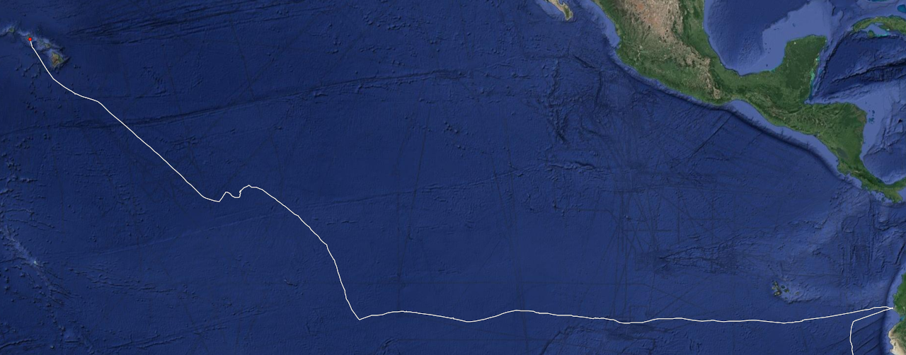 Alle 6 Tage läuft unser Wassermacher, d.h. für Hansueli und mich jeweils duschen, ein Luxus den wir sehr geniessen, denn es ist heiss und die Luftfeuchtigkeit ist sehr hoch. Die Wäsche fühlt sich feucht an. Für mich gibt es angenehmere Klimas. Den Äquator überqueren wir am 23. Tag kurz nach Mitternacht und opfern selbstverständlich Neptun (und uns) einen guten Tropfen. Wir haben in der Kalmenzone einige Tage leichtere Winde, kommen jedoch trotz Gegenstrom, wenn auch langsam, voran. Um in Hawaii in der richtigen Zeitzone anzukommen, setzen wir alle paar Tage die Uhr um eine Stunde zurück, d.h. fünf Mal eine Stunde (UTC – 10). Einmal sehen wir kleine Delfine hoch in die Luft springen und mit einem «Bäuchler» landen. Vereinzelt fliegen Möwen ums Schiff und zeigen ihre Flugkünste. (Fast) allein auf weiter See, das ist unser Alltag. Zwei Frachter und einen Tanker sehen wir in etwa 6 nsm Distanz. Dazu drei Fischerboote. Das ist die ganze «Ausbeute» bis kurz vor Hawaii.