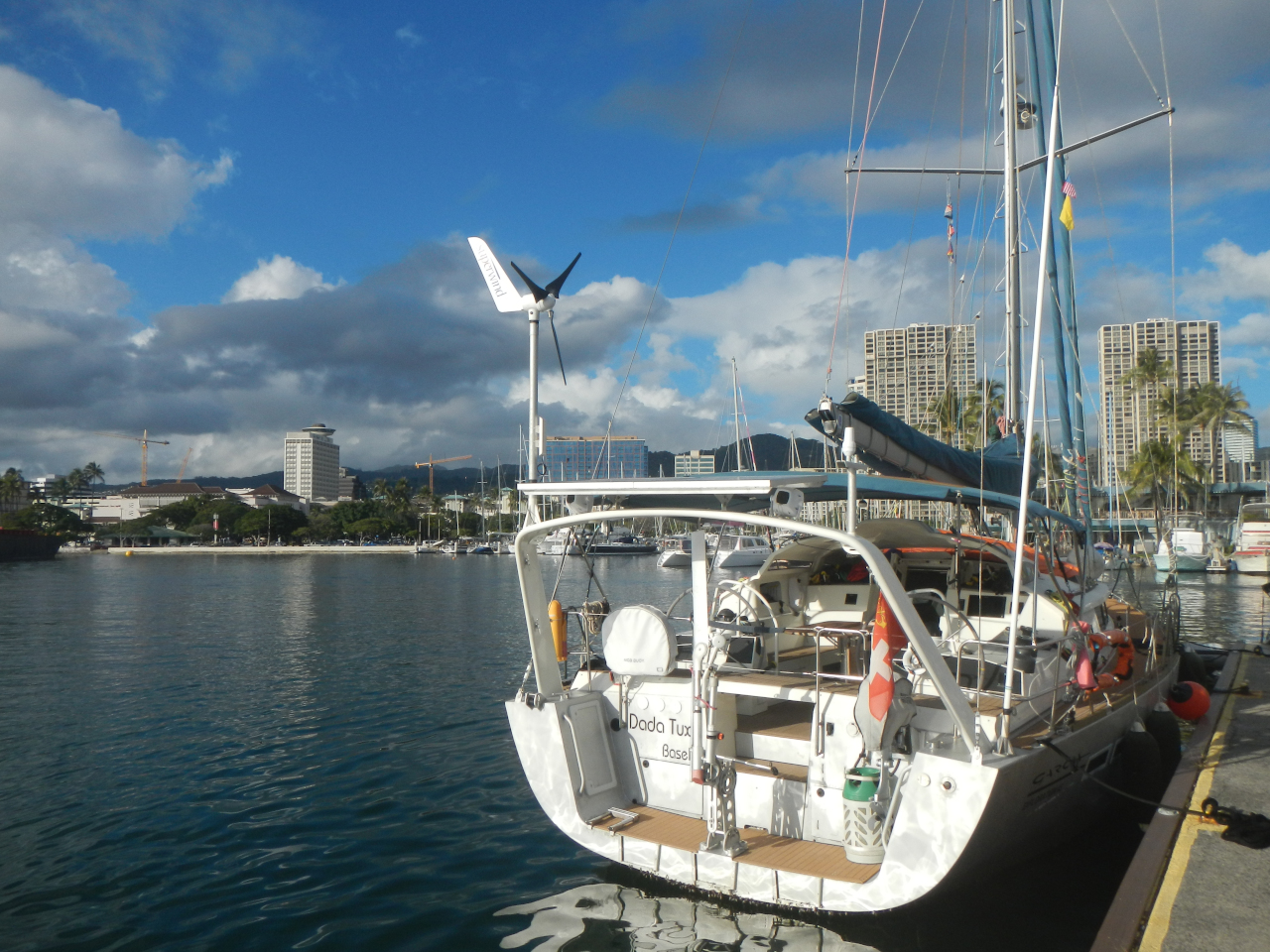 Von weitem sehen wir die Küstenwache, welche dann tatsächlich mit 5 Personen in einem Dingi an uns festmacht. Drei davon kommen an Bord und kontrollieren Papiere, Rettungsausrüstung, wollen den Abfall sehen fragen jedoch nicht nach ob wir noch frische Lebensmittel an Bord haben. So fahren wir mit den 3 Personen von der Küstenwache ins Hafenbecken ein und machen am alten Tankstellendock an bis alles erledigt ist. Die Behörde ist nett es ist jedoch für uns befremdendes Ankommen. Wir finden mit Hilfe eines Clubmitgliedes einen Platz im Hawaii Yacht Club längs eines Katamarans und können vorerst mal da bleiben. Von Bord dürfen wir erst, wenn der Zoll unsere Pässe abgestempelt und die Dada Tux «genügend» kontrolliert haben. Tatsächlich kommen um 20:00 zwei Männer vorbei, einer für die Pässe und Kontrolle, der andere für den Abfall. Unser Abfall geben wir in einem grossen dichten Plastiksack ab welcher verschlossen und entsorgt wird. Am nächsten Morgen müssen wir zum Zoll und bekommen die Bewilligung 1 Jahr mit unserer Dada Tux in US Gewässern zu segeln.
