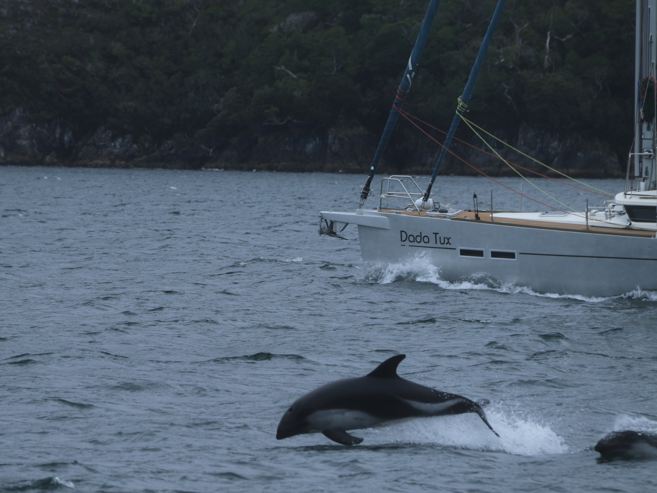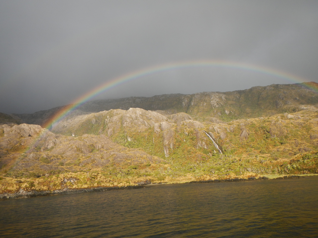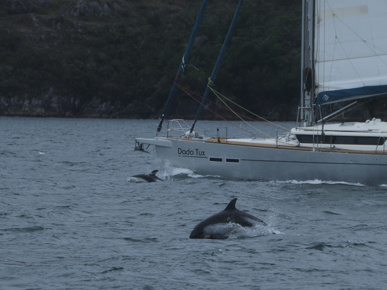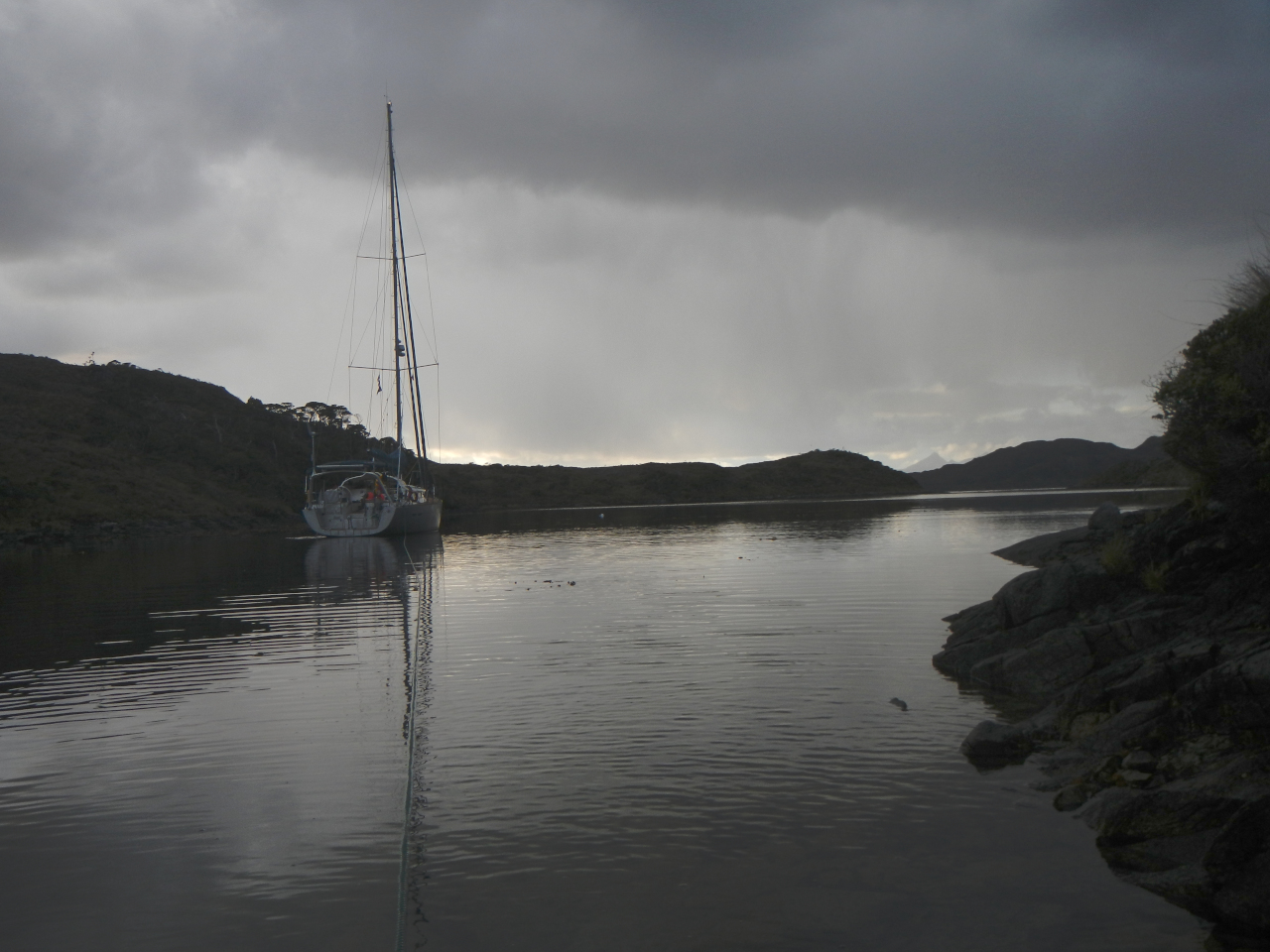 Zusammen gefasst heisst das, dass wenn wir Landleinen setzen benötigen wir zusätzlich zum ankern 1-2 Stunden bis wir los können, resp. abends ruhig schlafen können. In einigen Buchten kann man frei schwojen; diese stehen auf unserer Prioritätenliste. Wir setzen jedoch, je nach unserer Einschätzung Leinen bei Ankerbuchten welche als „keine Landleine nötig“ bezeichnet sind. Nach getaner Arbeit werden wir mit lieblichen, immer wieder anders geformten, üppig grünen Buchten, oft mit einem kleinen oder grösseren Wasserfall versehen, Delfinen, sogar Walen, Seevögeln, belohnt. Bis Puerto Eden fühlen wir uns in jeder Bucht gut geschützt und sicher, haben keine Fallböen, keinen Schwell und können ruhig und sicher schlafen.