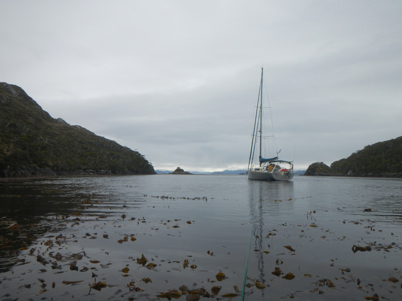 In der Regel sind die Ankerbuchten, ist man einmal innen, ruhig und man hat Zeit sich zu vertäuen. Wir lassen das Dinghi vor dem Anker setzen ins Wasser, bereiten Leinen, Ruder, evtl. Dinghianker, Ösfass vor, und Hansueli rudert sobald der Anker mit vorerst wenig Kette hält (was er nicht immer macht) an Land. Ich versuche in der Zwischenzeit das Boot „ruhig“ zu halten, damit es nirgends touchiert. Wenn immer möglich ziehen wir die Leinen zurück zur Dada Tux. Das erspart uns am Morgen das erneute Herunterlassen des Dinghis, an Land rudern und Leinen lösen, zurück zum Schiff, Leinen verstauen, Anker auf….Nicht zu unterschätzen ist der Kelp, welcher sich auch bei „sauberen“ Ankerplätzen an Ankerboje und Anker festhakt und ohne Kelpschneider und Bootshaken geht es nicht.
