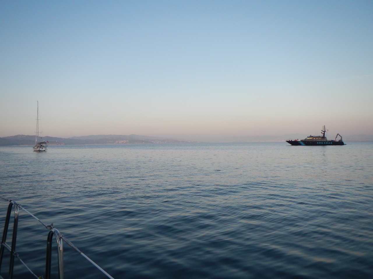 Tags darauf gehts von Portosin nach Illas Cias wo wir ankern. Es sind zwei wunderschön idyllische kleine Inseln an der Grenze zu Portugal. Wir geniessen den späteren Nachmittag mit lesen, einem „Zvieri“ und nichts tun. Mit uns sind es vier Segelschiffe und ein Katamaran, welche die Nacht dort verbringen. Kurz bevor wir uns an die Zubereitung des Nachtessen machen taucht ein schwarzes grösseres Motorboot in der Bucht auf. Es fährt ganz langsam auf uns zu. Da sehen wir die Aufschrift „Aduana“. Sie lassen ein Schlauchboot ins Wasser steigen zu dritt mit Helm und Gummistiefel ins Boot und kontrollieren alle vor Anker liegenden Schiffe. Sie wollen die Schiffspapiere und unsere Pässe sehen, füllen mühsam von Hand Formulare auf und verlassen uns zum Glück wieder, ohne die ganze Dada Tux auf den Kopf gestellt zu haben. Wir erhalten eine Kopie des Formulars, welches wir, sollten wir in den nächsten 3 Monaten in Spanien nochmals aufgehalten werden, vorzeigen können.