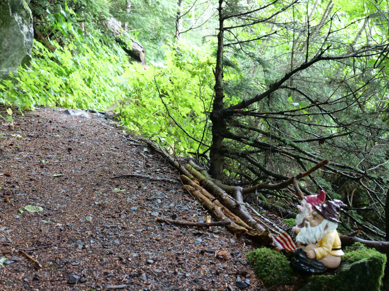 Die Überfahrt ist trist; Nebel, Regen, verhangene Berge, kaum Wind, zuerst unangenehme Wellen. Nach 71 Stunden 59 Minuten (gemäss Logbucheintrag) machen wir in Elfin Cove bei Regen fest. Am Steg liegen zwei kleinere Fischerboote. Diese werden oft von einer Familie oder zwei Personen betrieben. Hund und/oder Katze sind mit dabei. Es ist ein reges Kommen und Gehen, dazwischen ein Schwatz mit den Nachbarn um Neuigkeiten aus zu tauschen. Flugtaxis landen und starten. Elfin Cove ist eine Miniinsel nach Cape Spencer beim Eintritt in die berühmte Glacier Bay. Sie ist mit Schiff oder Flugzeug (kleine Sportflugzeuge) erreichbar. Der Ort ist äusserst niedlich, romatnisch, feenhaft. Ein hölzerner Fusssteg führt an den Häusern vorbei. Sprudelnde Bäche fliessen von den Bergen herunter, blühende Sommerflora und verwunschene Wege mit Gartenzwergen versehen führen fast rund ums Dorf. Vereinzelte neu aussenehnde «Lodges» für Sportfischer sind dieses Jahr wenig besetzt. Eine Fähre kommt 1x wöchentlich von Auke Bay (Juneau) und holt die Gäste ab, andere werden per Flugzeug gebracht und/oder abgeholt.
