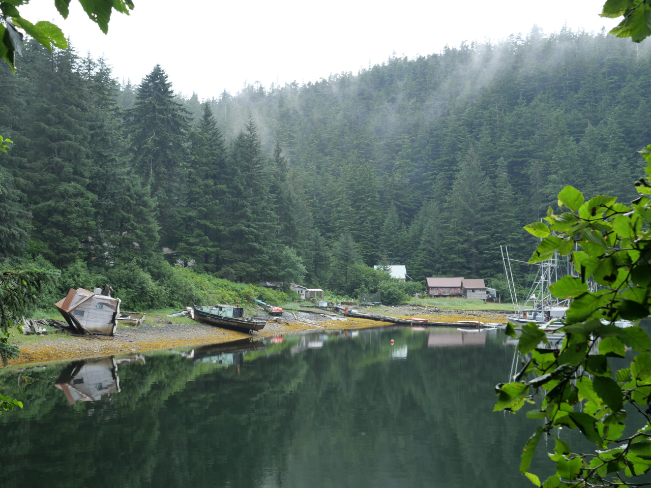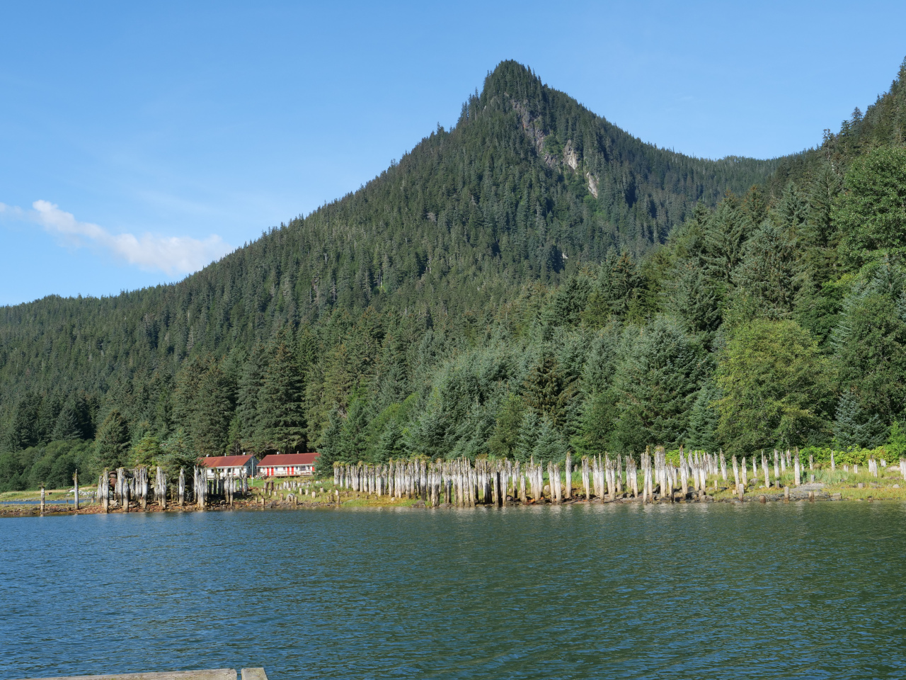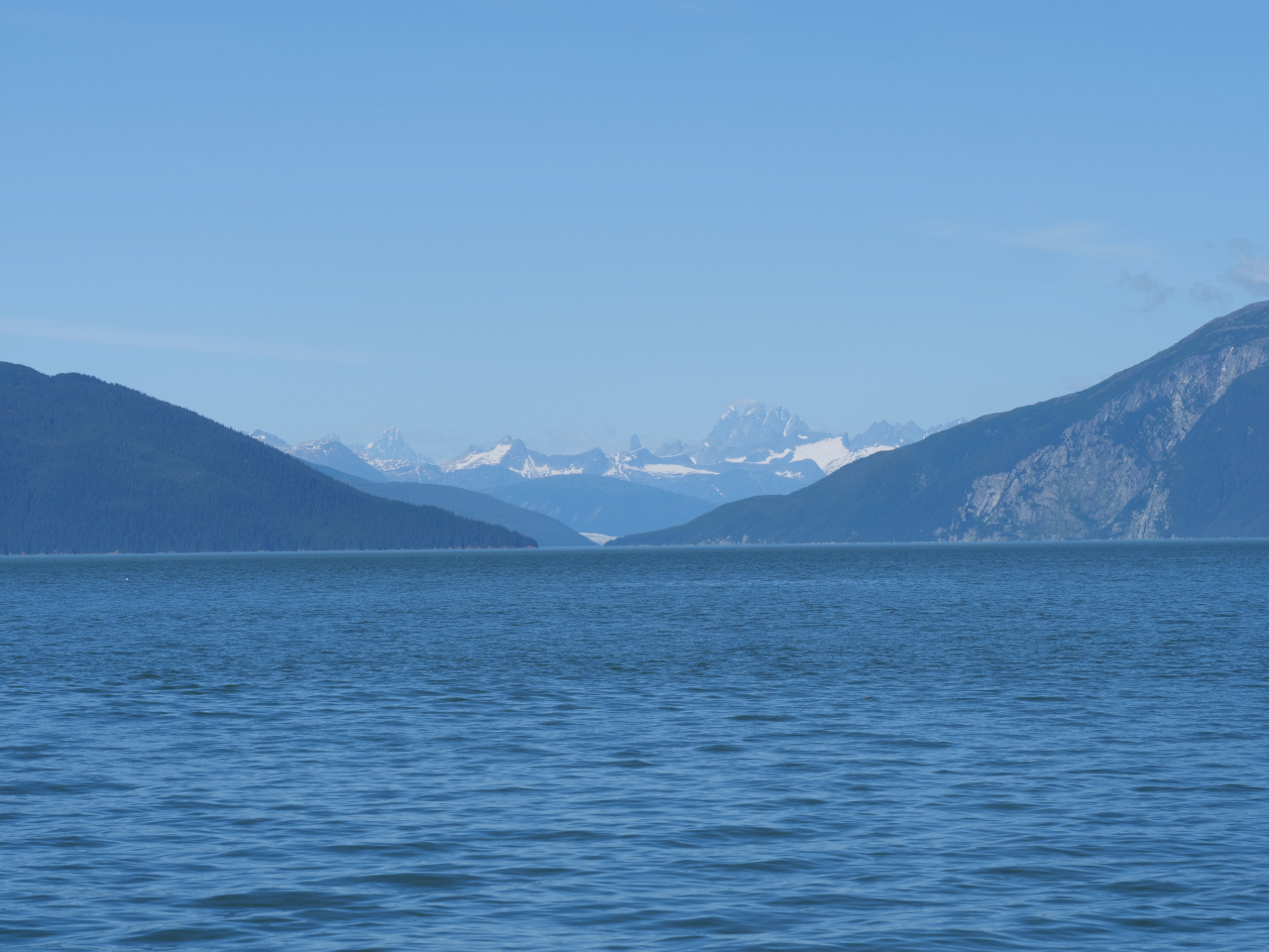 Erwähnenswert da Seltenheitswert in diesem Sommer: heute ist ein sonniger Tag und so sehen wir Auke Bay bei der Weiterreise von seiner schönsten Seite. Durch einen Teil der Stephan Passage erreichen wir Taku Harbor. Taku ist eine Untergruppe der Tlingit Urbevölkerung. Um 1900 entstand hier die erste Lachskonservenfarbik. Sie brannte 2 x nieder und schloss ihre Tore wegen Überfischung im Jahre 1953. Wir kommen ins Gespräch mit einer jungen Fischerfamilie (2 Kinder 4 und 2 Jahre alt plus Hund). Sie schenken uns einen «marinierten» Königlachs, welcher wunderbar mundet und wie Butter auf der Zunge zerschmelzt.