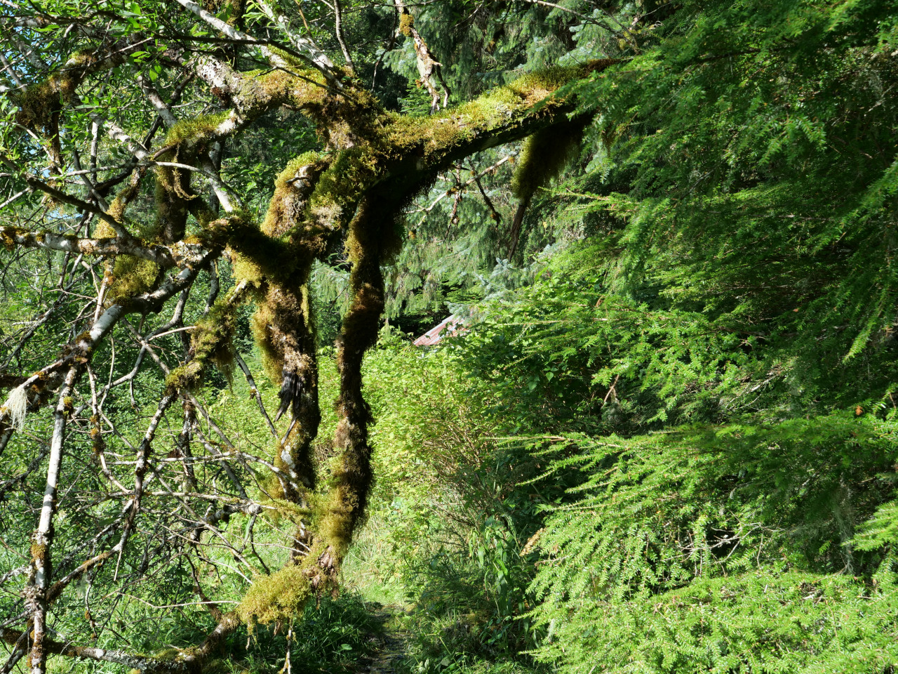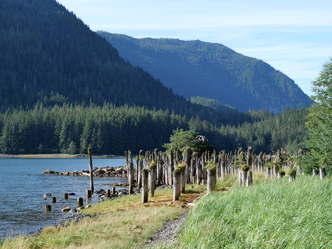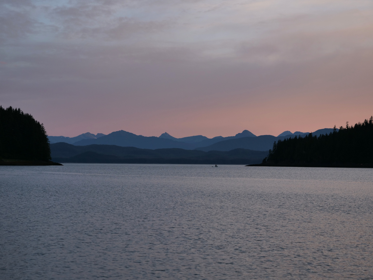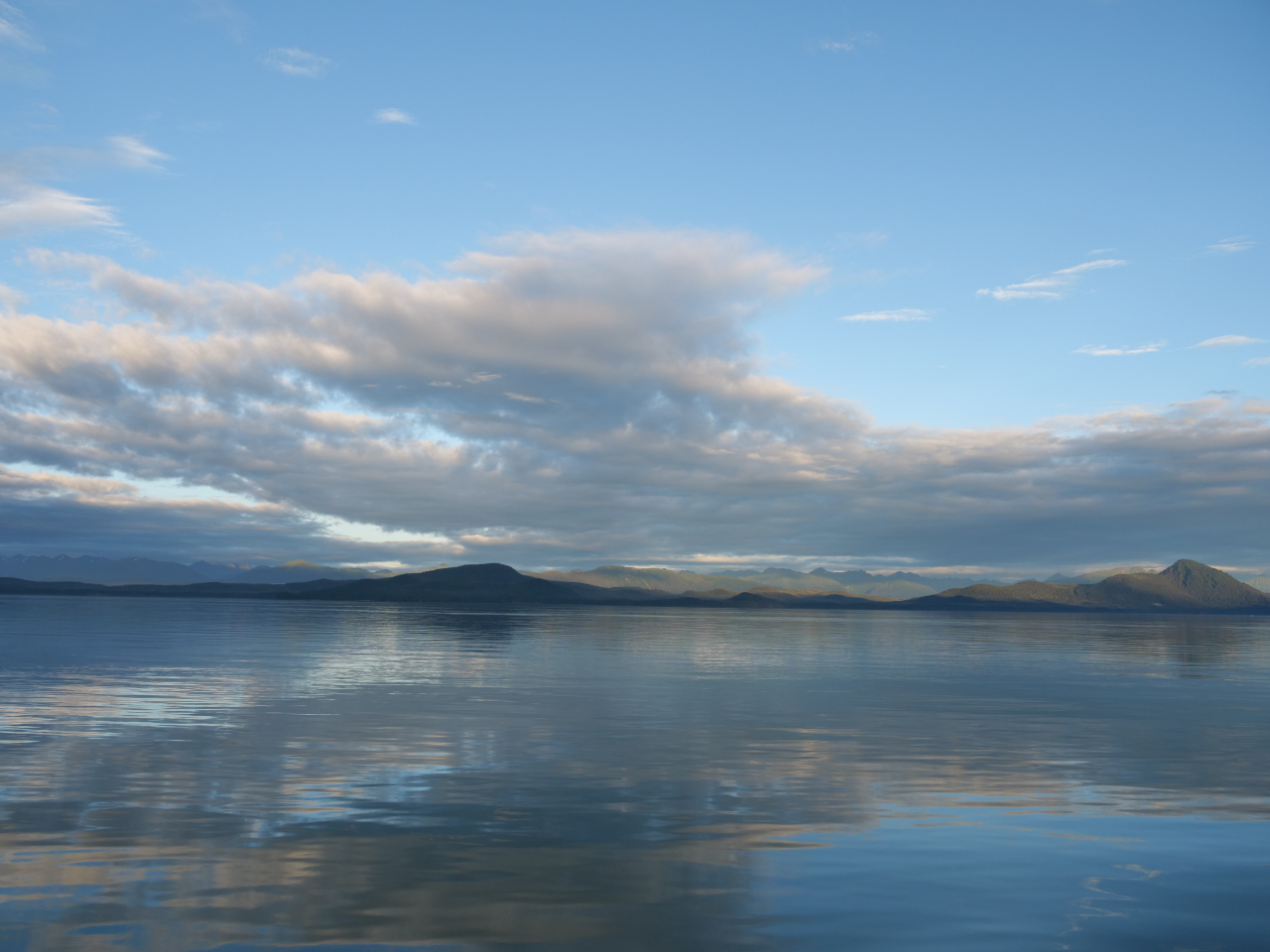 Erwähnenswert da Seltenheitswert in diesem Sommer: heute ist ein sonniger Tag und so sehen wir Auke Bay bei der Weiterreise von seiner schönsten Seite. Durch einen Teil der Stephan Passage erreichen wir Taku Harbor. Taku ist eine Untergruppe der Tlingit Urbevölkerung. Um 1900 entstand hier die erste Lachskonservenfarbik. Sie brannte 2 x nieder und schloss ihre Tore wegen Überfischung im Jahre 1953. Wir kommen ins Gespräch mit einer jungen Fischerfamilie (2 Kinder 4 und 2 Jahre alt plus Hund). Sie schenken uns einen «marinierten» Königlachs, welcher wunderbar mundet und wie Butter auf der Zunge zerschmelzt.