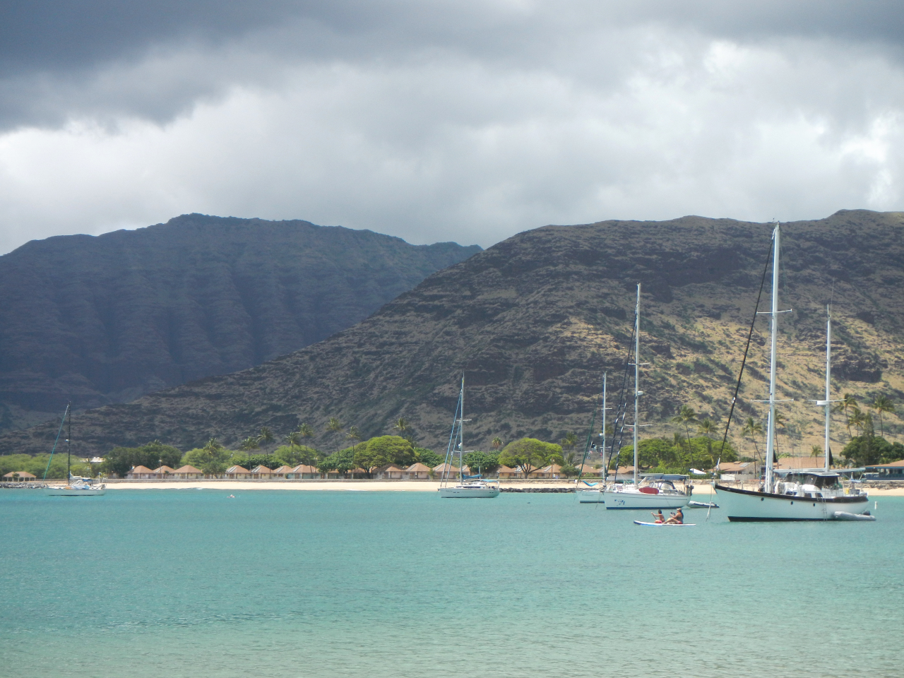 Nach 59 Tagen im Hawaii Yacht Club (HYC) beschliessen wir die Insel Oahu in einigen Tagen zu umrunden. Ein Art «Glücksgefühl» stellt sich ein. Wie sieht es wohl an den verschiedenen Küsten aus? Neugierig verlassen wir Honolulu bei unterschiedlichen Winden in westlicher Richtung, vorbei an Pearl Harbor, an schroffen, wenig bewachsenen Felsen jedoch Bilderbuch haften Stränden und lassen nach etwa 6 Stunden den Anker in der Pokai Bay fallen. Mit uns sind SY Alkemi mit Steve und Angela und SY Kuleana mit Dan und Kate vom HYC dabei. Wir sind nicht die Einzigen und so ankern gegen Abend gegen acht Boote in der Bucht. Der Strand (Wochenende) ist, vergleichbar mit was wir bis anhin erlebt haben, voller Leben, zahlreiche einheimische Familien mit ebenso zahlreicher Kinderschar tummeln sich am Wasser. Angelruten, SUP`s, Kanus, Tauch- und Schnorchelausrüstung gehören zur Tagesordnung. Musik dröhnt aus den Lautsprechern und innerhalb kurzer Zeit steht das «Tischlein deck dich», voll mit Fastfood, süssen Getränken, Bier. Die Menschen sind im Gegensatz zu den Menschen die wir von Honolulu kennen, dunkler mit einem polynesischen Einschlag und oft recht fett.
