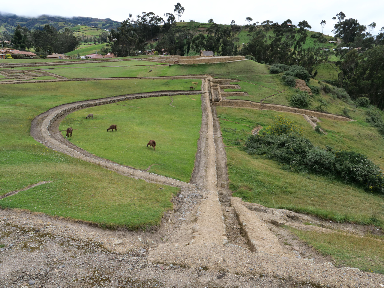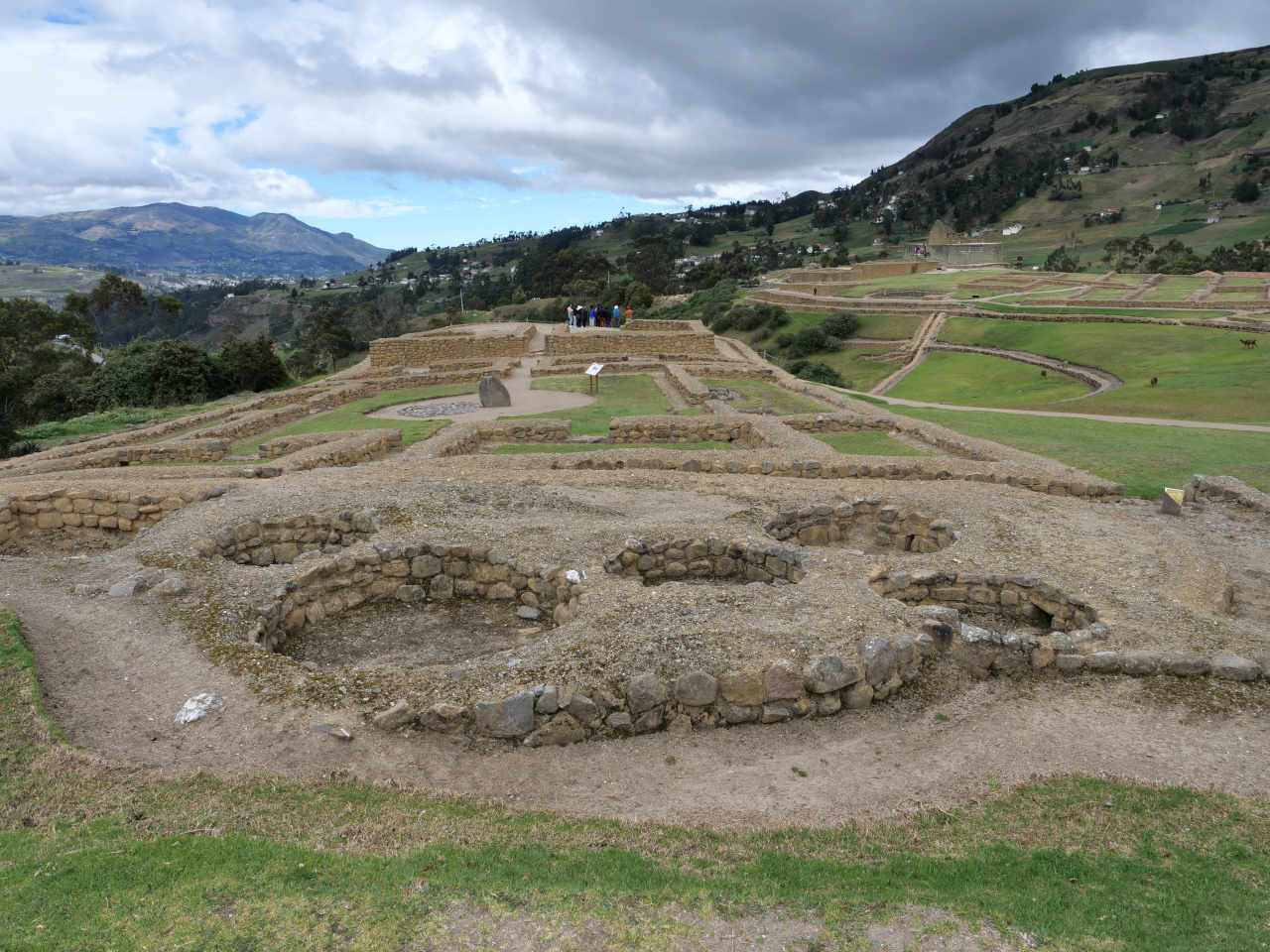 Erneut passieren wir den Äquator, besuchen die Pyramiden von Cochasqui. Es gibt Reste der Präinka, der Inka und einiges deutet darauf hin, dass auch von Mesoamerika Einflüsse der Mayakultur vorhanden sind. Der ganze Komplex ist sehr schön gelegen, erst vor etwas über 100 Jahren hat man die Pyramiden entdeckt, die Landeigentümer enteignet, und einige wenige Ausgraben vorgenommen. Lamaherden, ein Gemüsegarten sowie Nachahmungen der ehemaligen Behausungen runden das Bild ab.