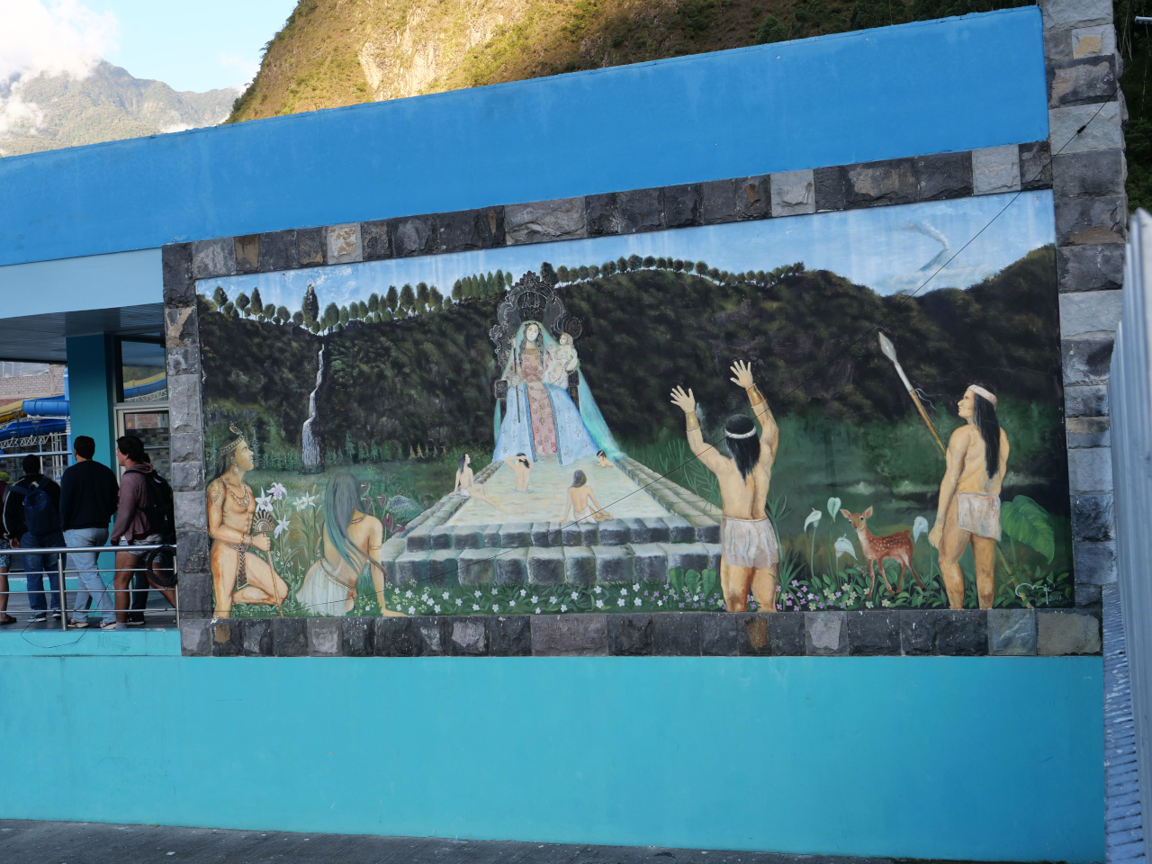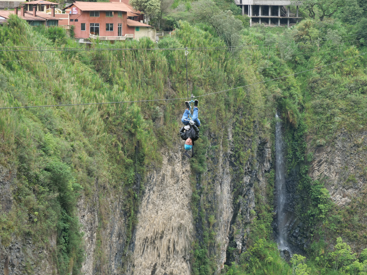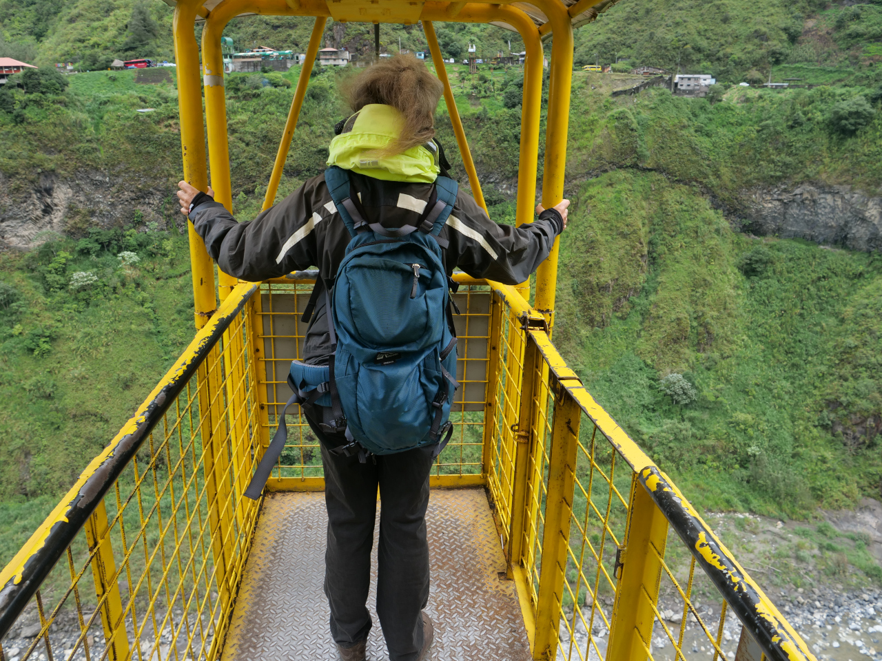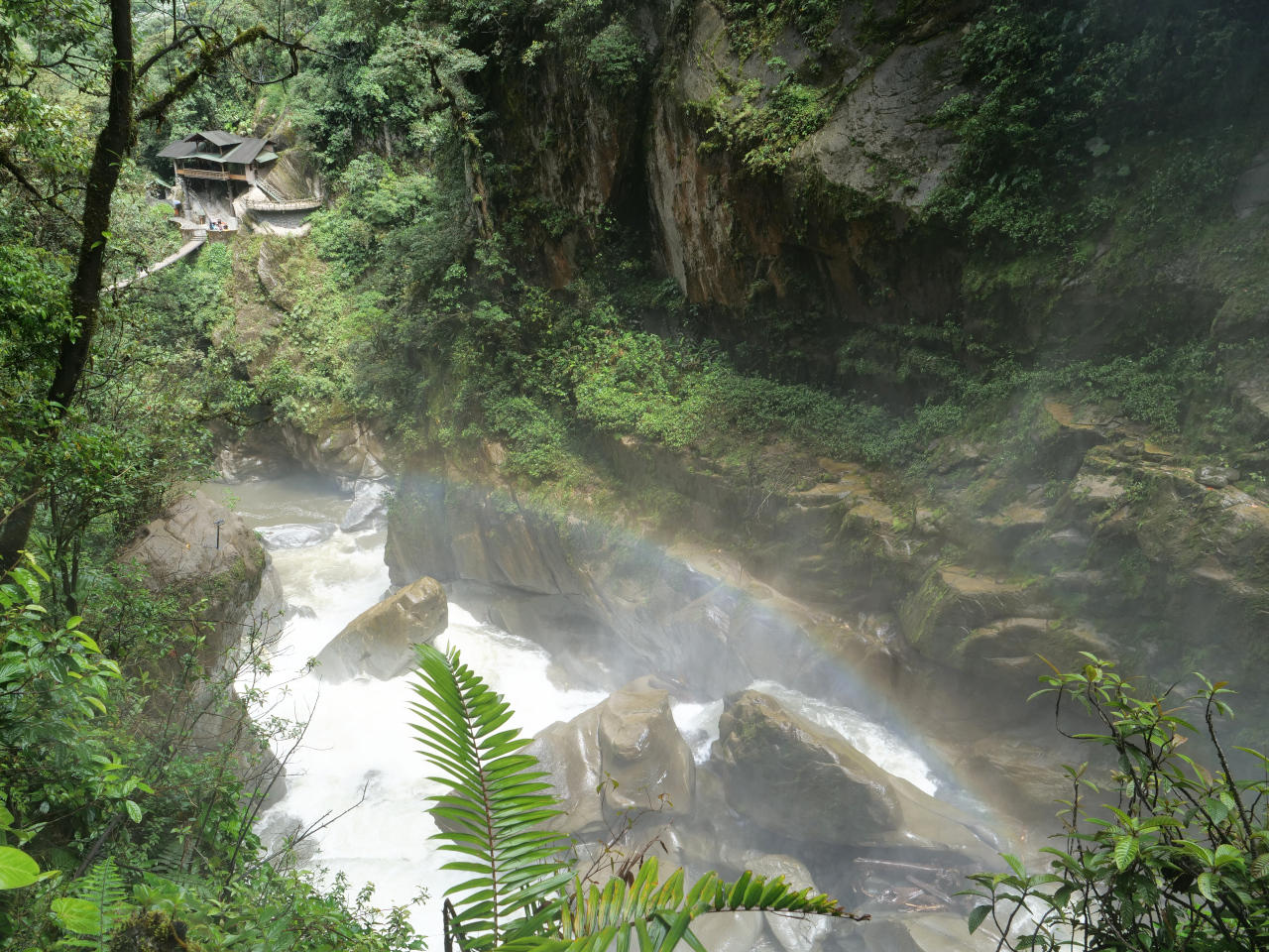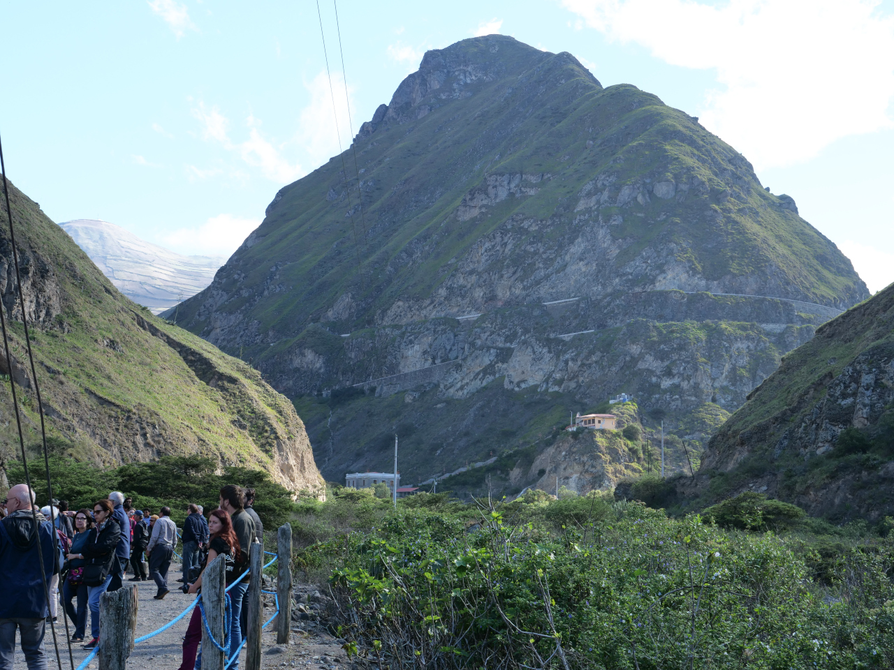 Das älteste Kirchlein Ecuadors passieren wir auf dem Weg nach Banos. Am Strassenrand brutzeln dicht hintereinander ganze Meerschweinchen (guy), ganze Schweine am Spiess und warten auf AbnehmerInnen. Banos (de Agua Santa) liegt beim Vulkan Tungurahua (5023) m hoch, der grosse Ausbruch datiert von 1773. «Gerettet» durch Maria ist Banos auch heute noch ein Wahlfahrtort. Thermalquellen und Bäder gehören zur Gegend ebenso wie unzählige Wasserfälle. Am Wegrand warten einige abenteuerlich anmutende Transportbähnli auf Touristen um sie über die Schlucht (je nach dem mehr oder weniger schnell) zu katapultieren und ihnen Schreie zu entlocken. Hansueli und ich «geniessen» zwei davon. Der Wind weht kräftig und die Nebelschwaden fliegen nur so um uns herum, so dass wir den Vulkan Tunguarahua nur für einige Sekunden, und dies leider ohne Foto, in seiner vollen Pracht sehen.