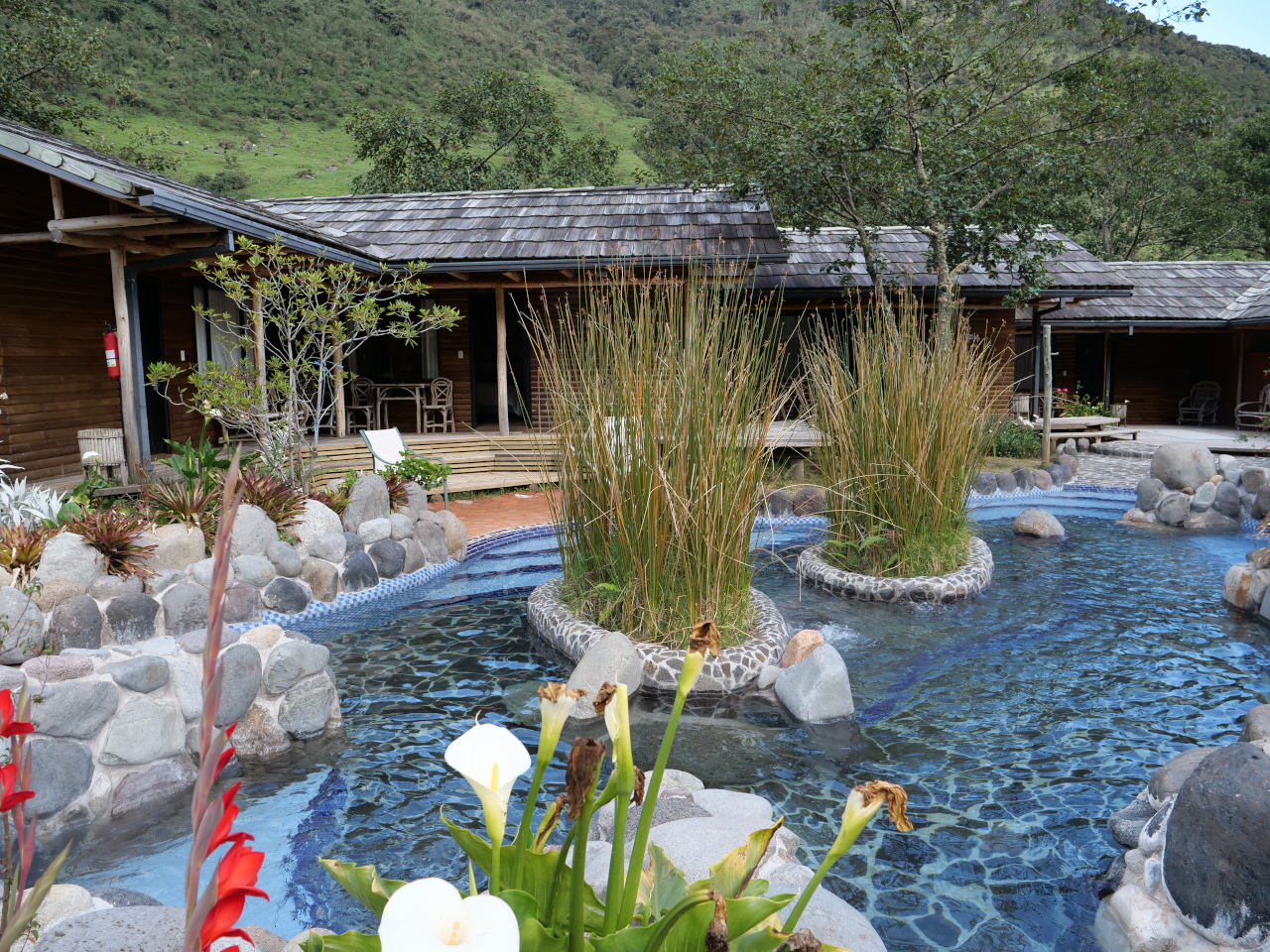 Eine kanadisch-amerikanische Gruppe mit einem 27 jährigen kanadischen Führer (anscheinend eine Koryphäe auf diesem Gebiet) scheint Tag und Nacht unterwegs zu sein. Wir lernen, dass es kaum mehr VogelbeobachterInnen gibt (mit Fernglas) sondern heutzutage mehrheitlich VogelfotografInnen. Eine Kanadierin zeigt uns ein Heft, worin sie alle Vogelarten, die sie sieht verzeichnet. Seitenlang sind die Eintragungen. Selbst freue ich mich, wenn ich diverse Kolibriarten sehe, Spechte, Eulen. Wir sehen bei der Fütterung eines sehr seltenen Vogel der kaum fliegt und sich mehrheitlich am Boden bewegt. Auch die kunstvollen Nestbauten regen meine Aufmerksamkeit an. Durch eine Gegend, auf den ersten Blick an`s Engadin erinnernd, fahren wir zu einem Thermalhotel in Papallacta und geniessen den freien Nachmittag mit einem wunderschönen Spaziergang entlang eines «Wildbaches» und ein Bad in dem etwa 35 Grad warmem Thermalbad, von unserem Zimmer aus erreichbar.