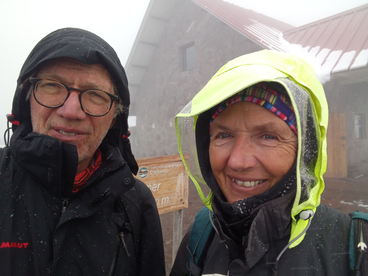 Den höchsten Berg Ecuadors, den Chimbarazo auf 6230 Meter, wollen wir nicht missen. Schneeregen und dichter Nebel machen uns nichts. Tapfer «wandern» wir von Parkplatz bis zurWhymper-Schutzhütte auf etwas über 5000 Meter hoch. Es ist dies unser erster Fünftausender. Bei je 2 Tassen heisser Schokolade erholen und wärmen wir uns bevor der Abstieg ansteht. Vom Berg selbst sehen wir kaum etwas. (Es gibt Postkarten)