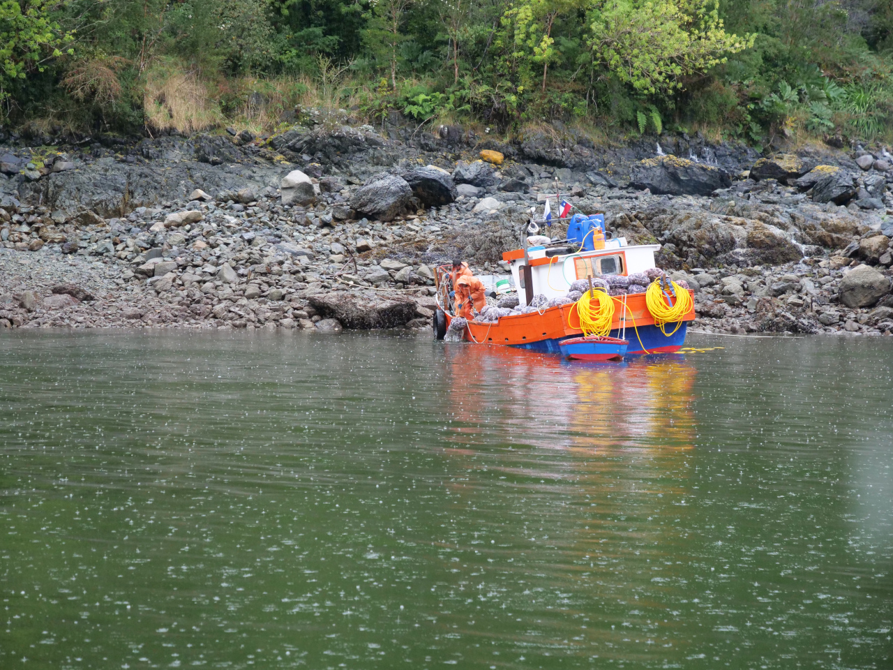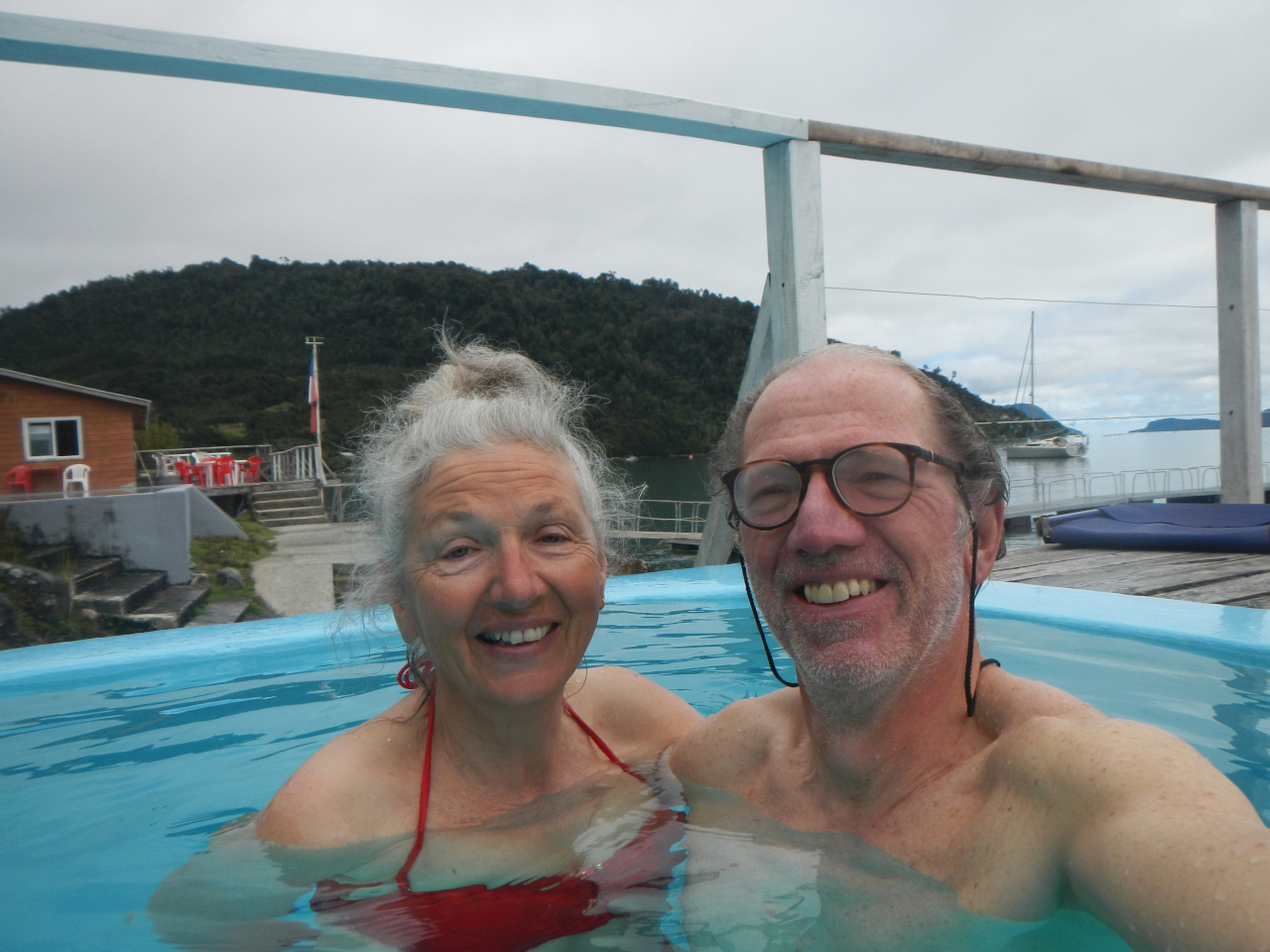 Zurück auf der Dada Tux entschliessen wir uns nochmals an die Westküste des Festlandes zu segeln und dabei verschiedene Insel(chen), Fjorde und eine Thermalquelle zu besuchen. Wegen Wind und Regen ankern wir in Puerto Bonito für zwei Tage. Ausser ein paar sehr arm selig wirkenden Hütten gibt es nichts. Eindrücklich, dass abends etliche Arbeitsboote einlaufen, sich mit dem Bug gegen den Fels legen, wo es vorbereitete Leinen gibt und sich mit dem Heck ebenfalls an einer (dünne) Leine vertäuen. So liegen sie bis zu dritt im Päckchen. Die kleinen Fischerboote widmen sich mehrheitlich dem Muschelfang. Ein oder zwei Taucher pro Boot holen, verbunden an einem längeren, meist gelben, an einem Kompressor befestigten Luftschlauch, unzählige Muschelsäcke ins Boot. Erstaunt hat mich vor allem, dass die Muscheln in Säcken hochgezogen werden. Da hatte ich eine ganz andere Vorstellung vom „freien“ Muschelfischen.