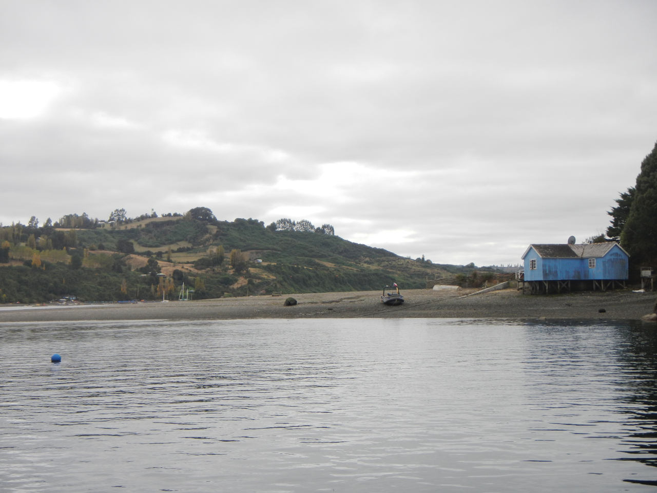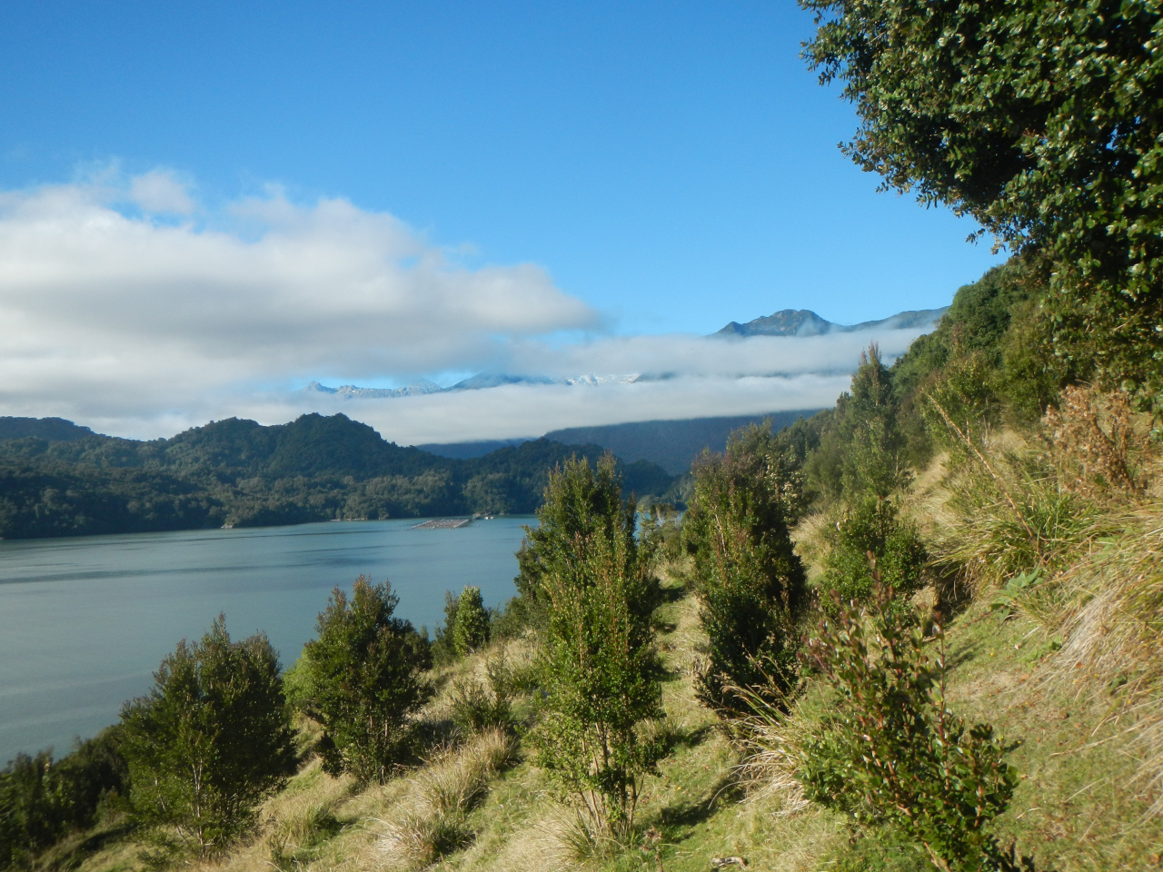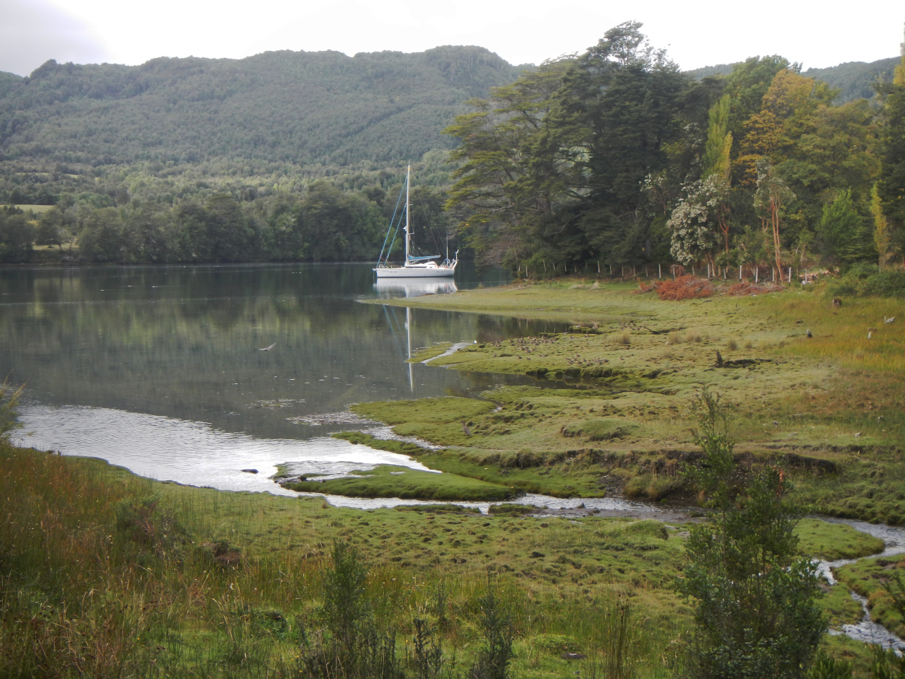 Drei weitere Etappen stehen uns vor der „Boca de Guafo“ bevor und führen uns durch die nicht mehr so raue, leider mit vielen Fisch- und Muschelfarmen gespickte Gegend. Die Gezeitenströme sind sowohl bei der Fahrt sowie auch beim ankern nicht zu unterschätzen. Strom mit oder gegen uns bis zu 4 oder mehr Knoten sind schon ein Unterschied und vor Anker wird das Land, resp. das Wasser rund um das Boot bei Unterschieden zwischen Ebbe und Flut von 4-6 Metern mehr oder weniger. Die Landschaften sehen dann teilweise sehr unterschiedlich aus.