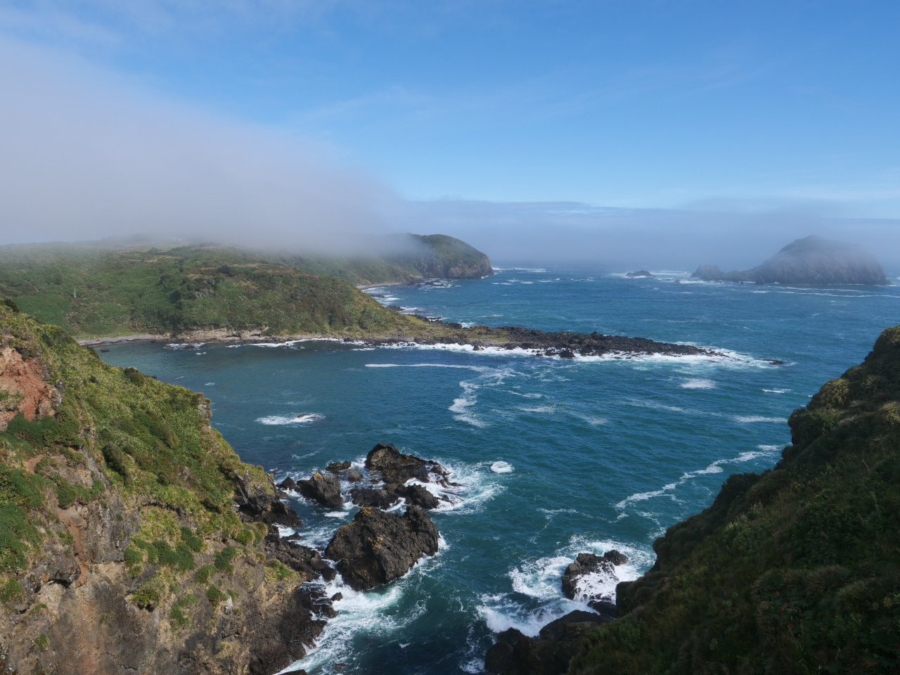 Der Weg bis zur nächsten und letzten kleineren offenen Überfahrt nach der zweitgrössten Insel Südamerikas Chiloé, der „Boca del Guafo“, bringt uns zuerst nach Puerto Aguirre auf der kleinen Insel Las Huichoas. Beim Vorbereiten zum anlegen sehen wir im letzten Moment, dass wir auf einen kleinen Felsen zusteuern und nur die Geistesgegenwart von Hansueli mit einem Vollstopp rettet uns davor auf zu laufen. Mit Kuchen, Kaffee und Wein feiern wir zusammen mit Black Forest meinen Geburtstag.