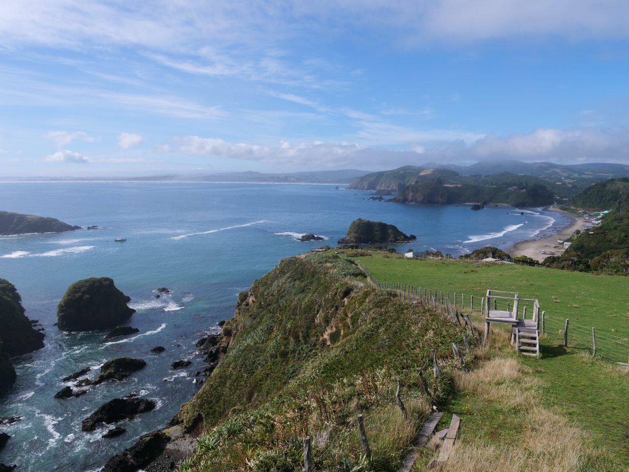 Die hübsch geschwungen Hügelzüge erreichen kaum mehr als 800 Meter. Unzählige typische Holzkirchen von Chiloé lassen auf einen missionarischen Eifer schliessen.