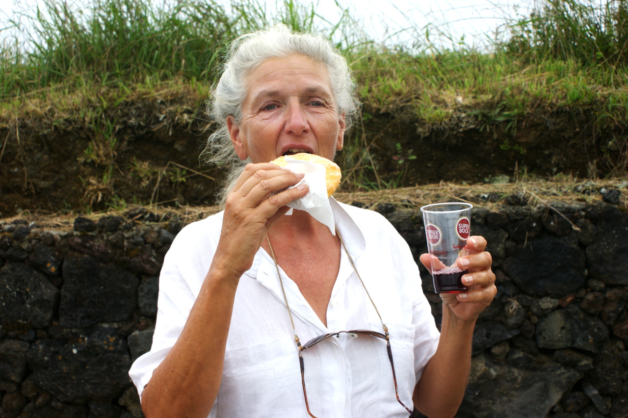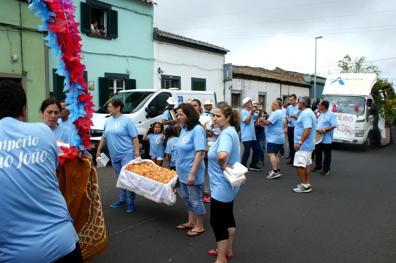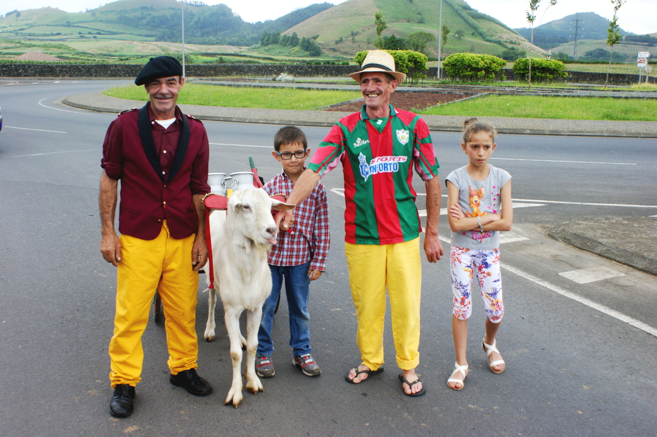 Zum Abschluss unseres zweiten Autotages sehen wir kurz vor Ponta Delgada, in einem kleinen Dorf, einen Umzug. Wir halten an und werden sogleich von den Einheimischen freundlich empfangen, mit Wein, Bier und Gebäck, so eine Art dicke „Fasnachtschüechli“. Es ist wohl am ehesten vergleichbar mit einem Erntedankfest und wir geniessen inmitten der Bevölkerung für eine kurze Zeit diesen Anlass.
