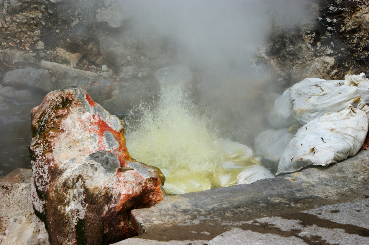 Auch an einer anderen „Ecke“ des Dorfes sprudelt, raucht und riecht es. Nicht zum Bade lädt dieser Platz ein, dafür werden im Schwefeldampf Maiskolben gegart, anschliessend verkauft und gegessen. Natürlich versuchen wir ein „Schwefelwassermaiskolben“. Er schmeckt fein und zart, ganz ohne Schwefelgeruch.