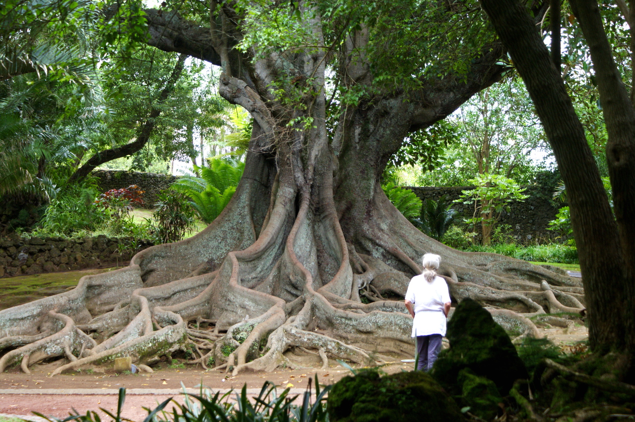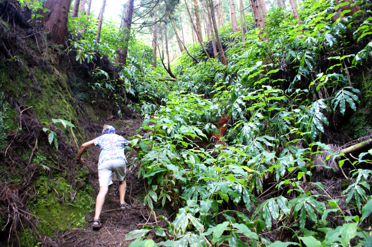 Dafür haben wir für zwei Tage ein Auto „ergattert“. Über zum Teil sehr enge Landstrassen entdecken wir die Gegenden, welche mit dem Bus nicht oder kaum erschlossen sind. Üppige Naturhecken befinden sich zu beiden Strassenseiten. Hortensien in blau, weiss, rosa scheinen wie Unkraut zu wuchern ebenso Winden, welche in einem wunderbaren Violett ganze Hänge „verzieren“. Daneben gibt es Farnbäume, (zu) viele Schmetterlingsingwer, eingeführt vom Himalaja, verschiedene mir nicht bekannte, jedoch „kleidsame“ Pflanzen und Blumen. Diese Üppigkeit ist gegeben durch das feuchtwarme Klima. Die Luftfeuchtigkeit liegt so zwischen 85 – 90 %. So haben wir das Gefühl fast in der Karibik zu sein.