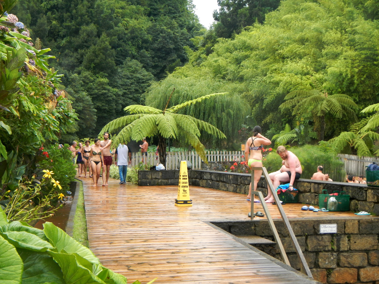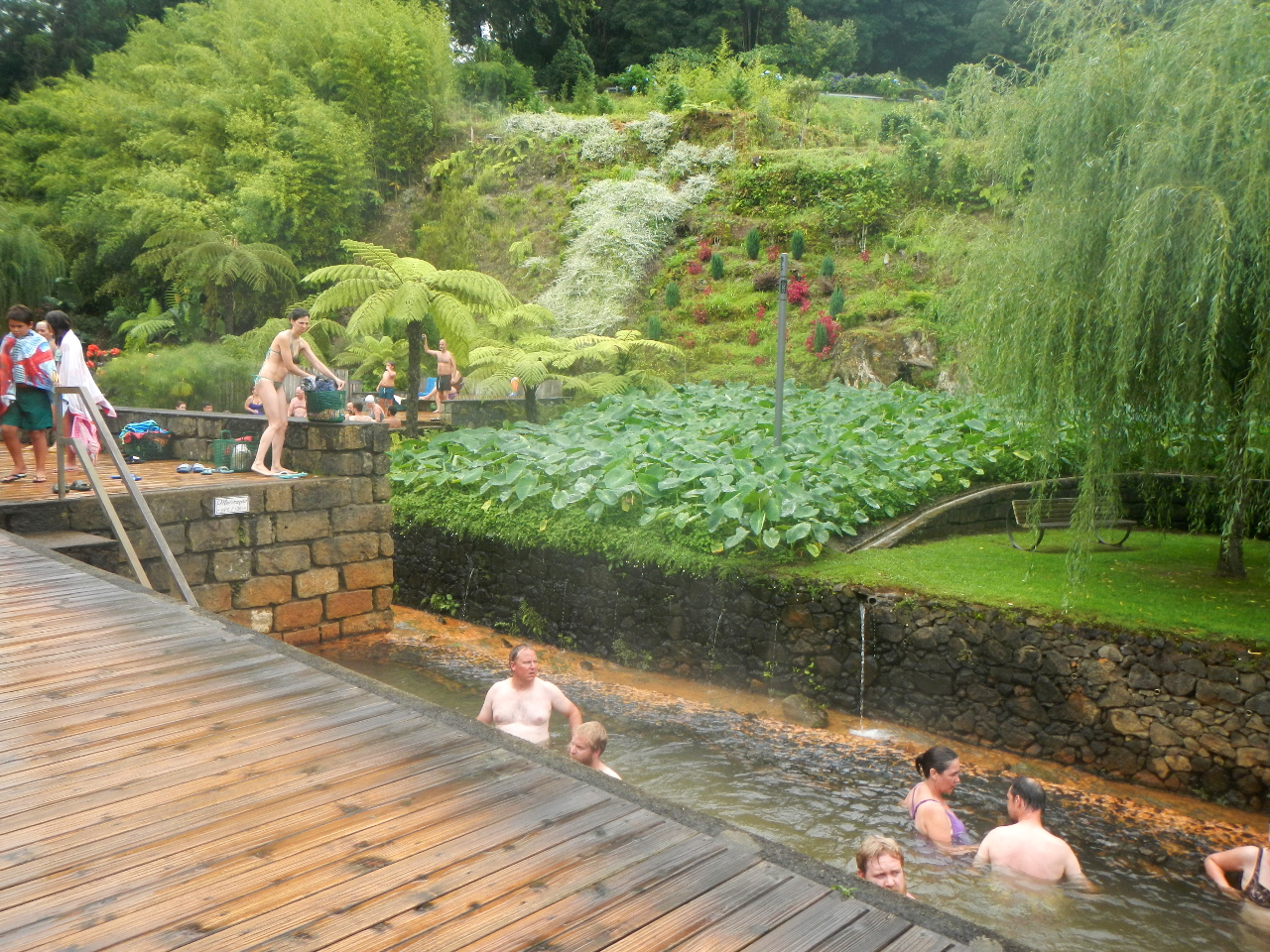 Tags darauf nehmen wir den Bus in die andere Richtung. Wir fahren der Küste entlang südostwärts bis zu den Thermalquellen von Furnas. Wir reihen uns ein unter die Badegäste der schwefelhaltigen 39°igen Badebecken. Dazu regnet es und ich fühle mich ganz so wie ich mir so eine Kur vorstelle.