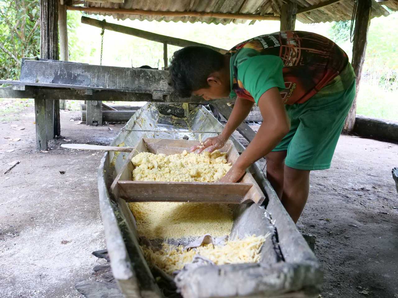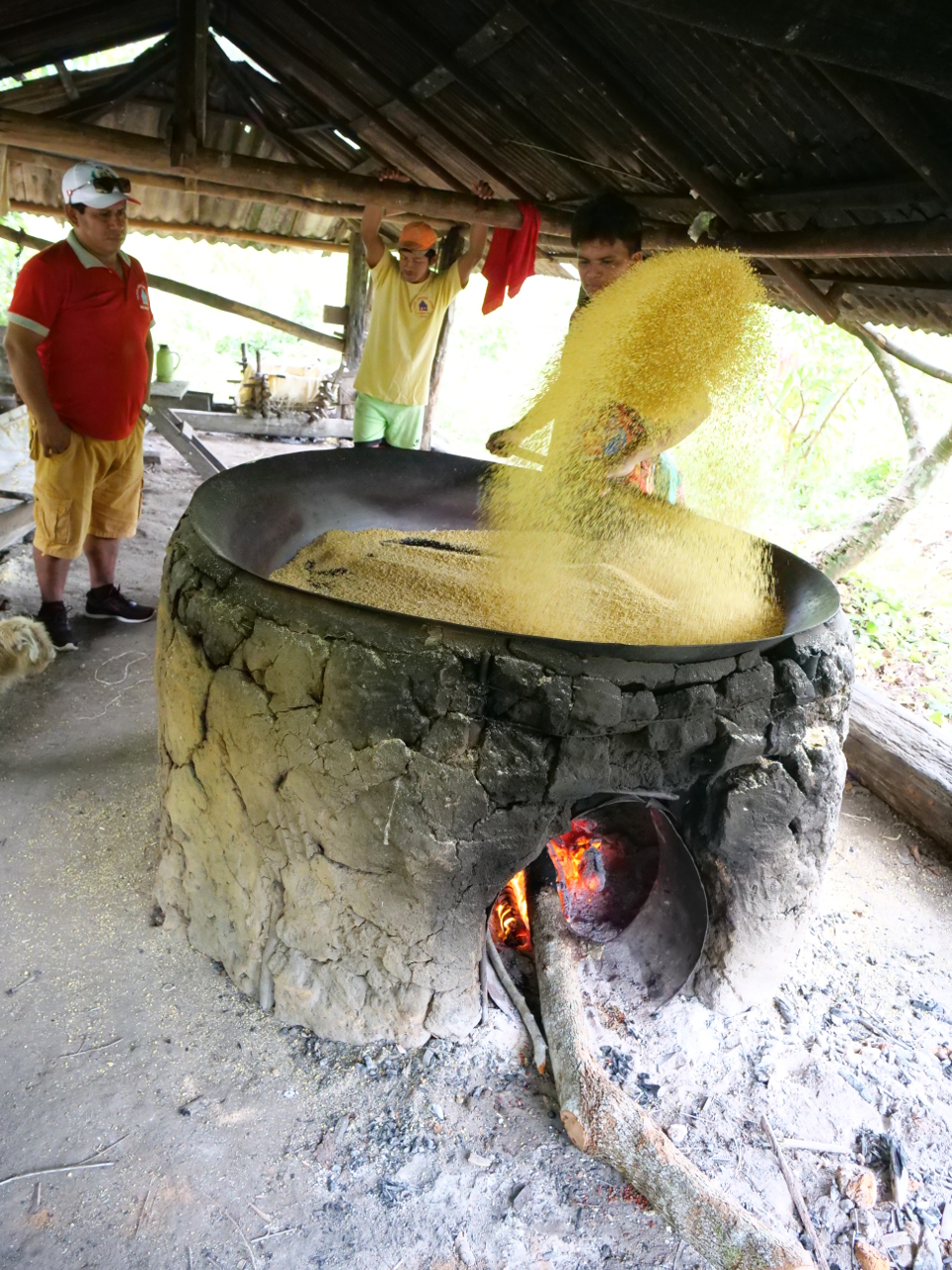 Maniok ist die tägliche Nahrung der ansässigen Bevölkerung und wir besuchen eine Maniokplantage und haben das Glück, dass wir bei der gesamten Verarbeitung zusehen können. Jede Familie hat ihre eigene Produktion, das dazu gehörende Material bis hin zum Ofen, wo das gepresste, gereinigte, gesiebte Maniok etwa 2 Stunden geröstet und immer wieder gedreht wird. Von klein auf helfen alle Familienmitglieder mit und erlernen so das Handwerk. ![]()