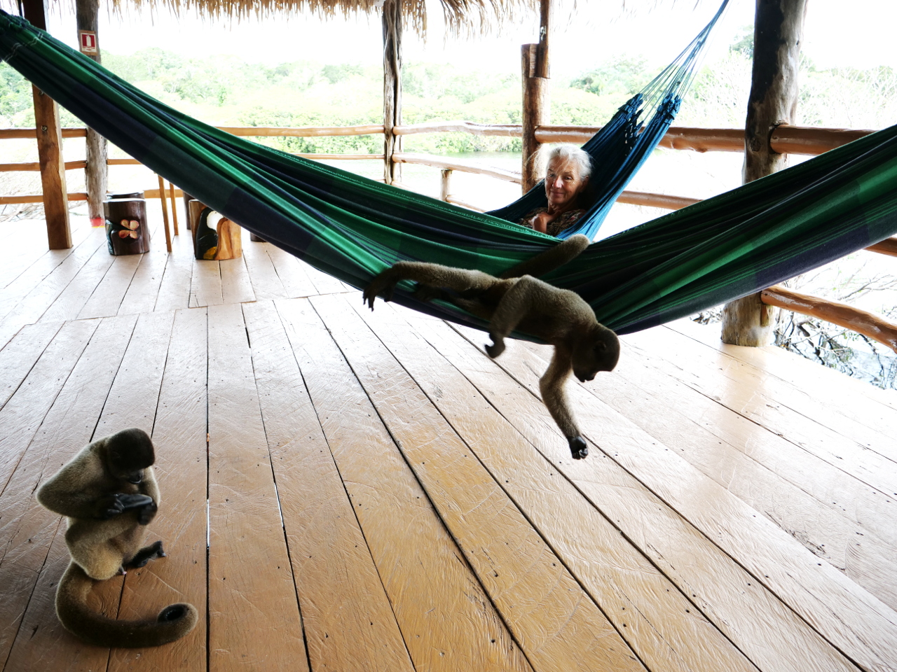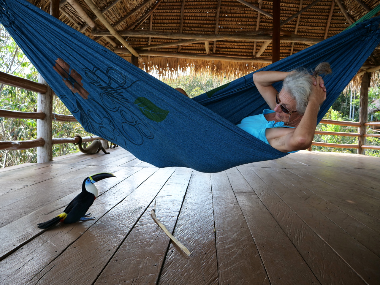 Ein Ausflug mit einem kleinen Ruderboot nur Hansueli und ich hat sehr wohl seinen Reiz. Für mich ist es, wie man so schön sagt, eine win/win Situation. Ich geniesse die geruhsamen, interessanten Tage, teils in der Hängematte, die Affen, Papageien, Tucane, eine Art Haus-Wildschweine, unzählige Vogelarten, Käfer, Schmetterlinge und Krokodil(augen) beobachtend, teils der Stille lauschend, den extrem lecker und liebevoll zubereiteten Mahlzeiten zugetan und nicht zuletzt der Herzlichkeit der Mitarbeitenden.