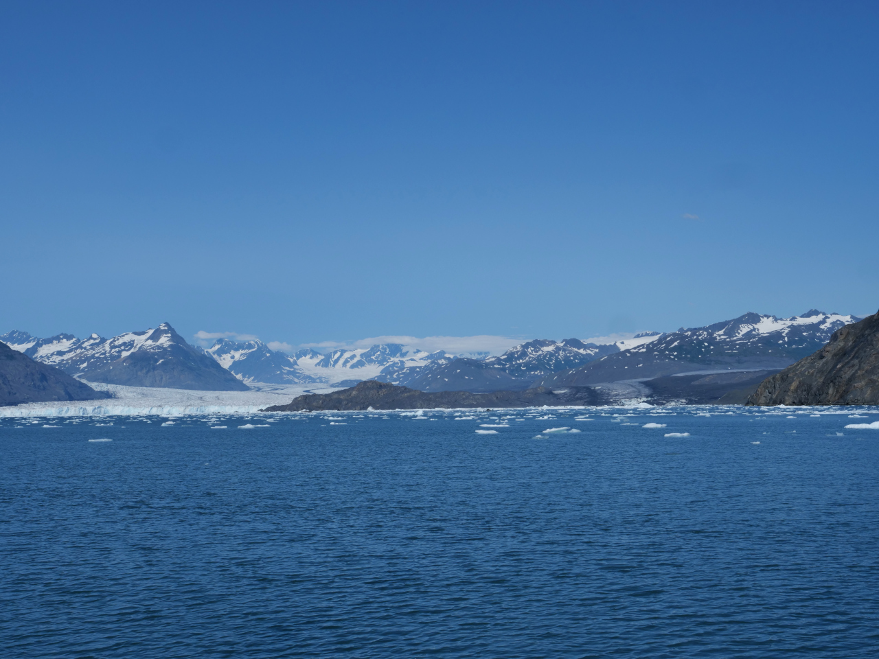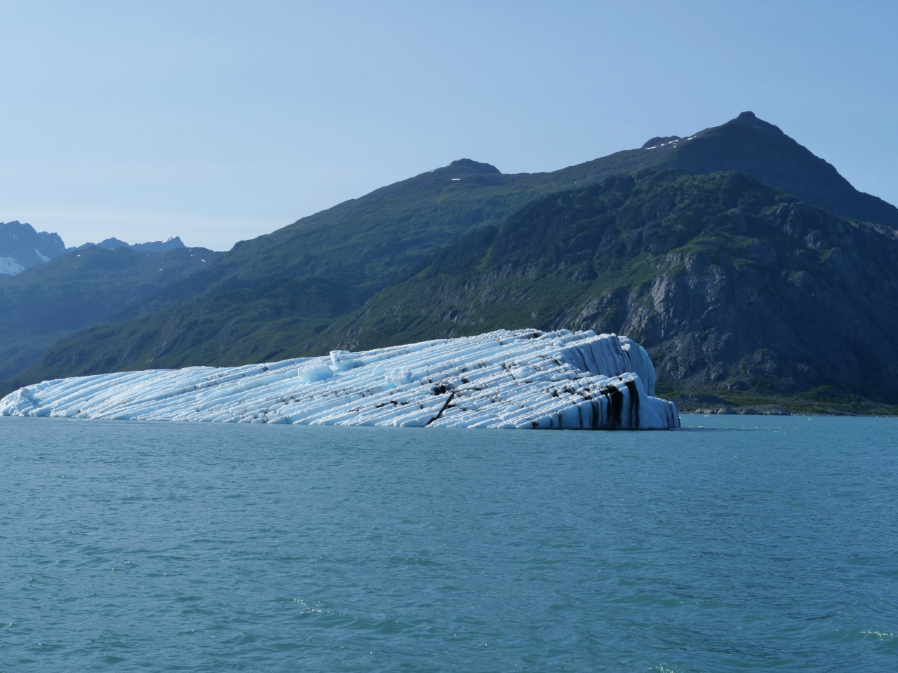 Grau und verhangen beginnt der nächste Morgen mit Tagwache um 05:30. Die Fernsicht ist bis gegen Mittag schlecht dann klart es auf. Sogar einige Meilen können wir «nur» unter Segeln zurück legen. Bis anhin sind wir vorwiegend, wenn überhaupt, ein Motorsegler. Einige des uns von Kodiak bekannten Fischerboottyps sind unterwegs ohne zu fischen. Bis zu sechst sind sie miteinander verbunden oder warten den Ufern entlang. Da ist wohl die Lachsjagd noch nicht frei gegeben worden. Durch die Perry Passage, vorbei an skurrilen Inselformen und von Gletschern bedeckten Fjorden nähern wir uns dem Columbia Gletscher. In 10 km breiter Front wälzt sich die Eiszunge aus dem Bergmassiv des Mount Einstein ins Meer. 80 Meter hoch ist seine Stirnseite wo immer wieder riesige Eistücke abbrechen. Unter riesigem Getöse fallen sie ins Wasser und können schon mal einen Minizunami auslösen. Der Columbia Gletscher, benannt nach der New Yorker Universität, ist jedoch leider der Gletscher welcher sich in den letzten Jahrzehnten am meisten zurückgezogen hat. Riesige Eisblöcke (auch kleinere) triften ruhig an uns vorbei bis wir nach einer Fahrt von etwa 12 sm hinter einer Kurve versteckt seinen majestätischen Anblick geniessen.