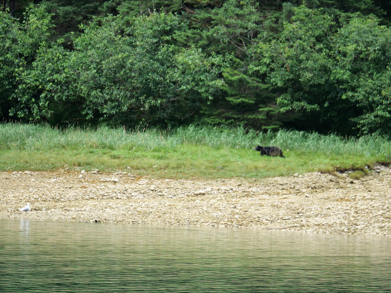 Schweinswale kreuzen kurz unseren Weg. Für die nächsten Tage ist Starkwind aus Osten angesagt und wir suchen Schutz in der Comfort Cove wo auch reiches Tierleben versprochen wird. Die Weisskopfseeadler sind in der Tat in unseren Augen deutlich grösser als die bisher gesehenen, Seeotter und Seehunde tauchen auf und verschwinden. Am Ufer «begrüssen» uns zwei Schwarzbären, jeweils einzeln. Wir bleiben zwei Tage an Bord, es regnet fast ohne Unterlass und die Nähe der Bären lässt uns einen Landgang verschieben.