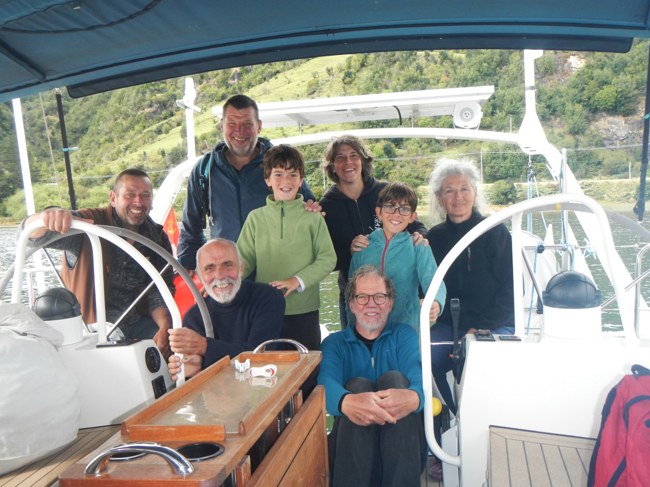 Beim Grenzübergang stossen wir auf die Crew von SY Pikaïa, mit Manu, Gaëlle mit Söhnen Renand und Jules. Ihr Schiff ist wegen Unterhaltsarbeiten immer noch in Buenos Aires und so reisen sie mit dem Auto durch einen Teil Argentinien und Chile. Welch Zufall – und so sitzen wir bald mit ihnen, Werner und Bernhard von Black Forest in der Dada Tux bei einem gemütlichen Essen und Austausch.