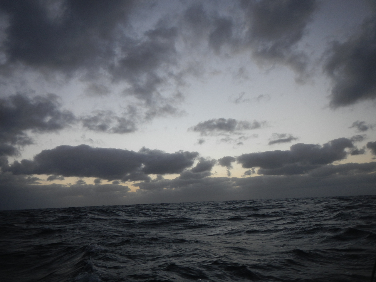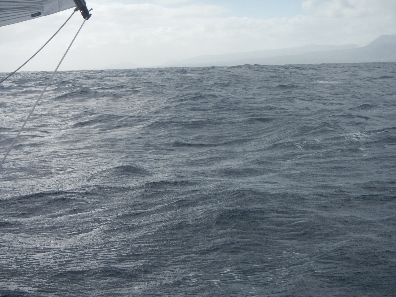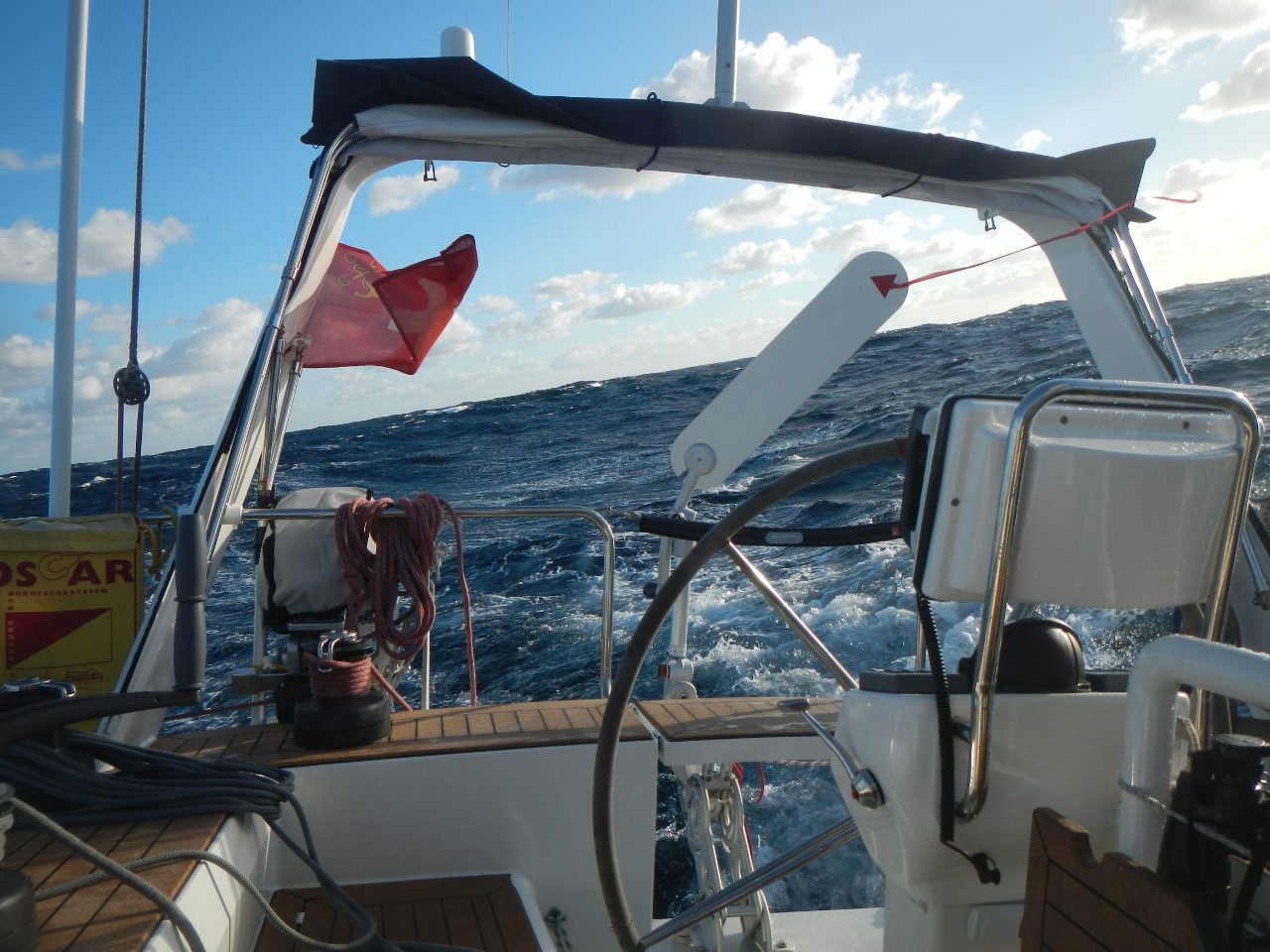Wir setzen die Segel sobald wir aus der Ausfahrt Marina de Lagos heraus sind und segeln zuerst etwas Richtung südwest mit einem Reff im Gross und der Genua. Schon bald darauf ergiesst sich ein Platzregen über uns, der jedoch nur kurze Zeit anhält, dafür noch mit zwei weiteren aufwartet. Wind und Wellen legen zu, wir fahren in die Nacht hinein und beginnen unsere Nachtwache im drei Stunden Rhythmus. Beim ersten „Schichtwechsel“ reffen wir die Genua, etwas später, bei bis zu 30 kn Wind und einer Wellenhöhe von gegen 4 Meter setzen wir das dritte Reff im Grosssegel und der Kutter ersetzt die Genua. Unser vorgekochtes leckeres Nachtessen „opfern“ wir Rasmus und für die ersten zwei Tage ist wenig an`s Essen zu denken. Wir kauen auf trockenen Biskuits herum und trinken etwas Mineral. Anfänglich begegnen uns Schiffe welche von Gibraltar her kommen oder aus  Richtung Norden Gibraltar ansteuern. Da heisst es doch immer wieder gut aufpassen, sie sind grösser und schneller als wir.