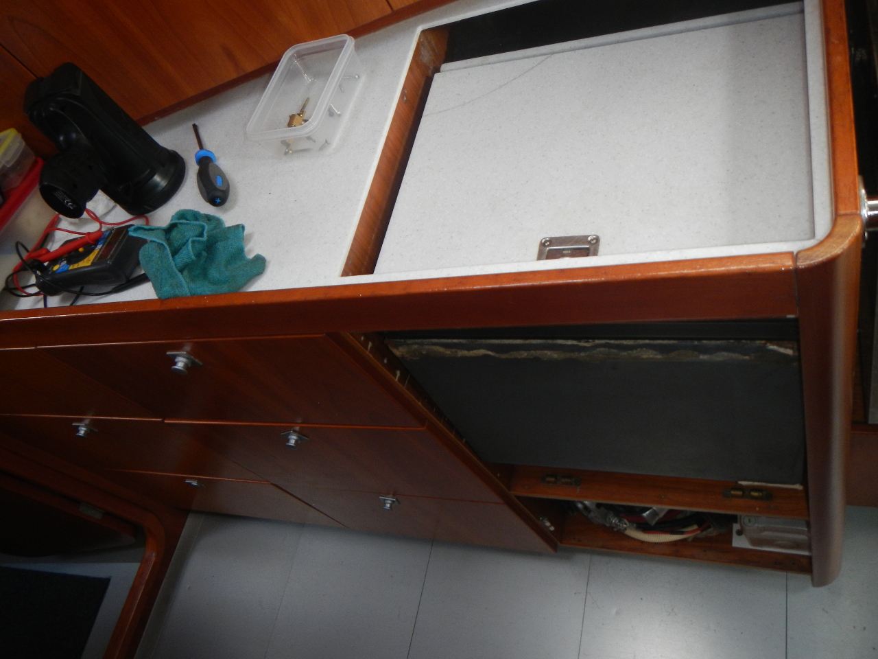 Freitagnachmittag kommt sogar ein Mechaniker auf`s Schiff. Hansueli baut vorgängig, in mühsamer Kleinarbeit, den Kühlschrank so weit wie möglich aus. Im Moment läuft er wieder, zuerst fast als Tiefkühler, im Moment „normal“. Wahrscheinlich hängt das Ganze mit unserer elektronischen Stromversorgung zusammen. Auch damit setzt sich Hansueli gekonnt auseinander, während es für mich „spanisch“ ist. Dafür ist die spanische Sprache für mich kein „spanisch“, womit wir wieder einmal erleben, dass wir uns doch recht gut ergänzen.