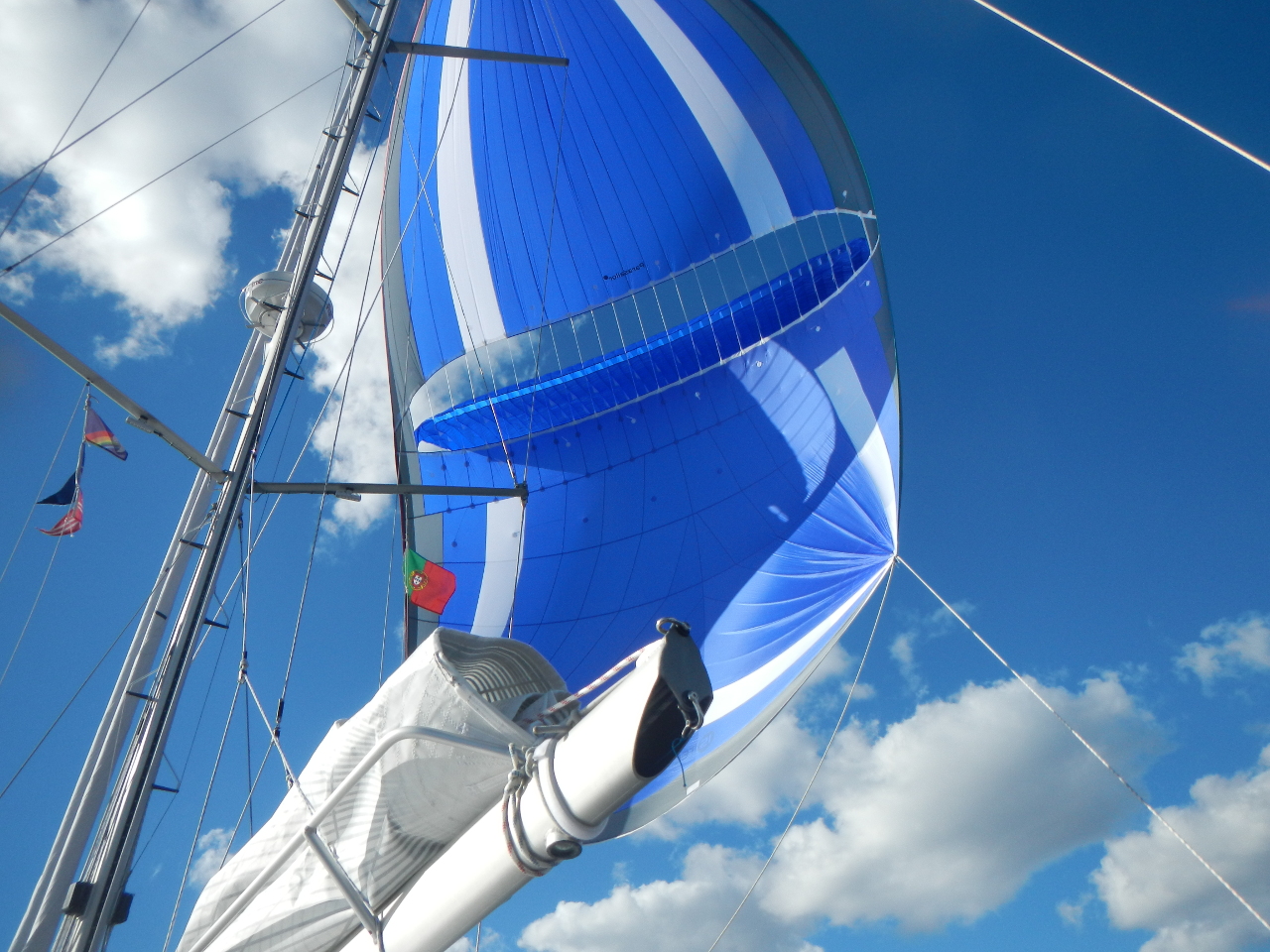 Wir reisen in der Vollmondphase. Es ist hell nachts und die See glitzert. Langsam werden die Wellen, bei etwa gleicher Windstärke, etwas weniger, es wird deutlich angenehmer. Wir rauschen in der ersten Zeit, Reff drei und Kutter mit 7 – 9 kn Richtung Kanaren. Am nächsten Morgen lässt der Wind nach und wir entschliessen uns den Parasailor zu setzen. Dieser „zieht“ uns für einige Stunden gut weiter, bevor wir ihn, wegen Zunahme der Windstärke, wieder bergen. Persönlich bin ich froh, dass in der Regel mein „Job“ vom Cockpit heraus gemacht werden kann und ich nicht, wie Hansueli, auch dem Vorschiff „herumturne“, selbstverständlich mit eingeklinktem Sicherheitsgurt.